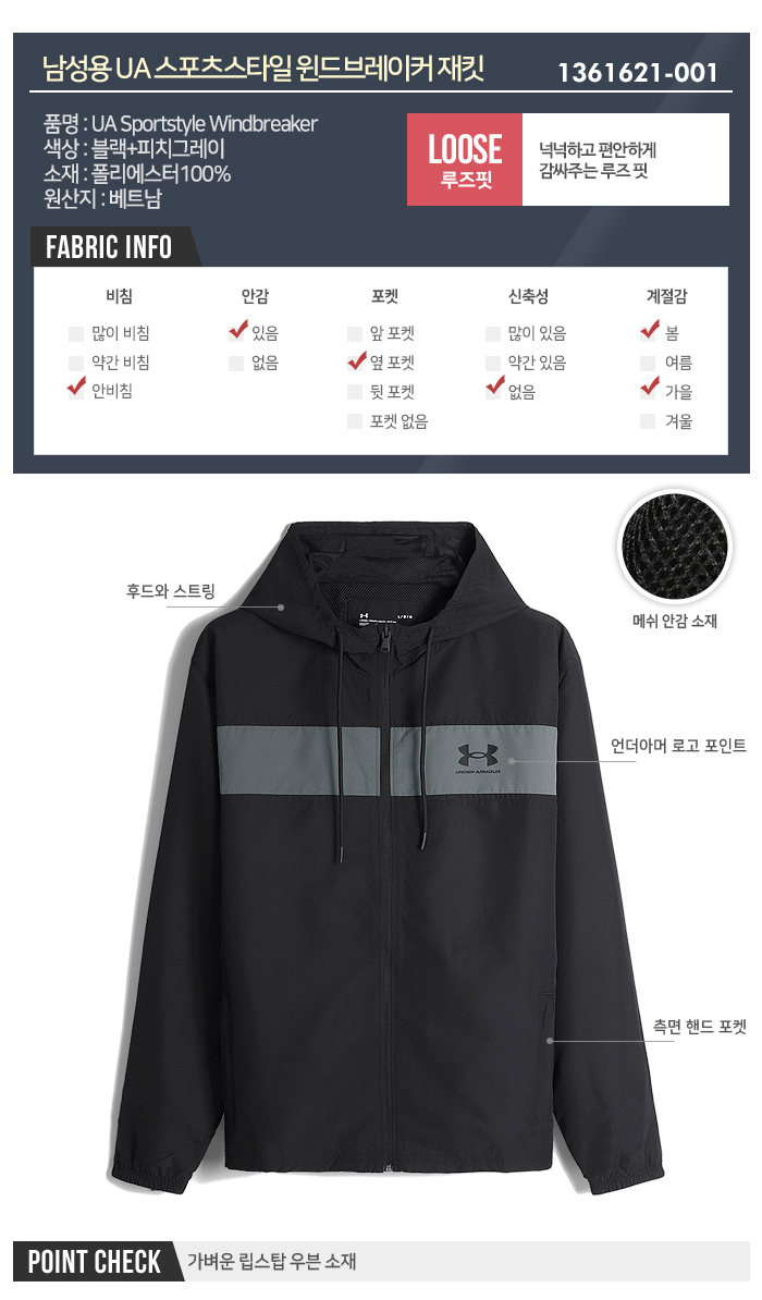 (현대Hmall)언더아머 남성용 스포츠스타일 윈드브레이커 재킷 1361621-001