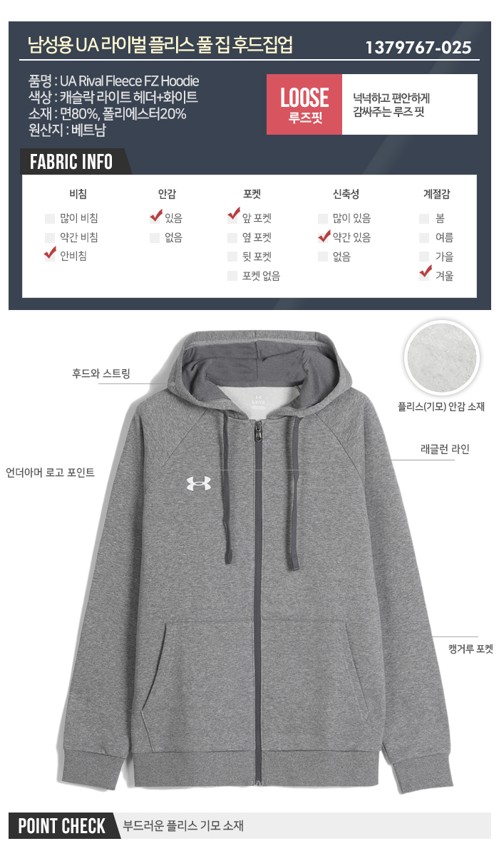 (현대Hmall)언더아머 남성 라이벌 플리스 풀 집 후드집업 1379767-025