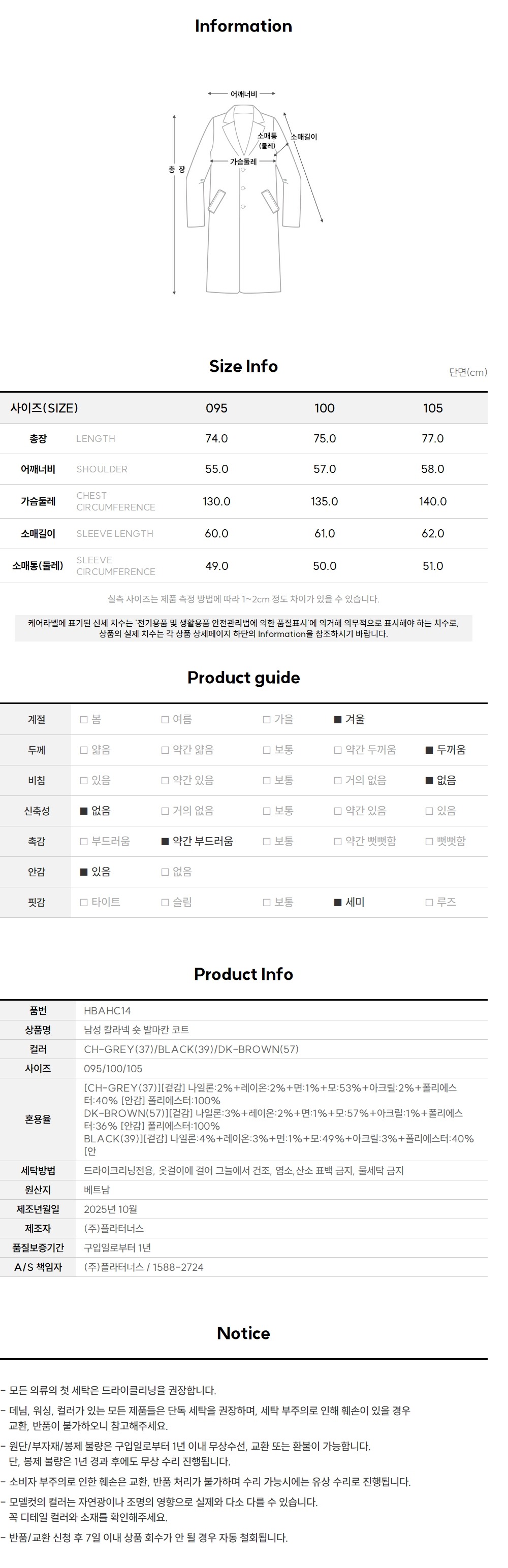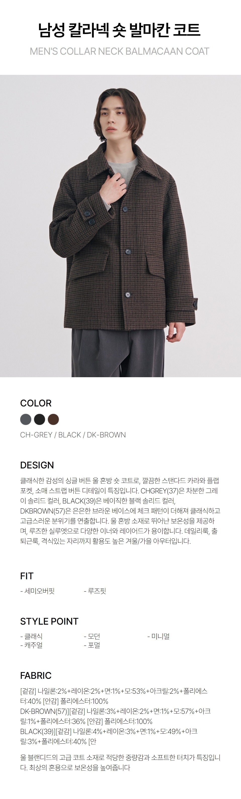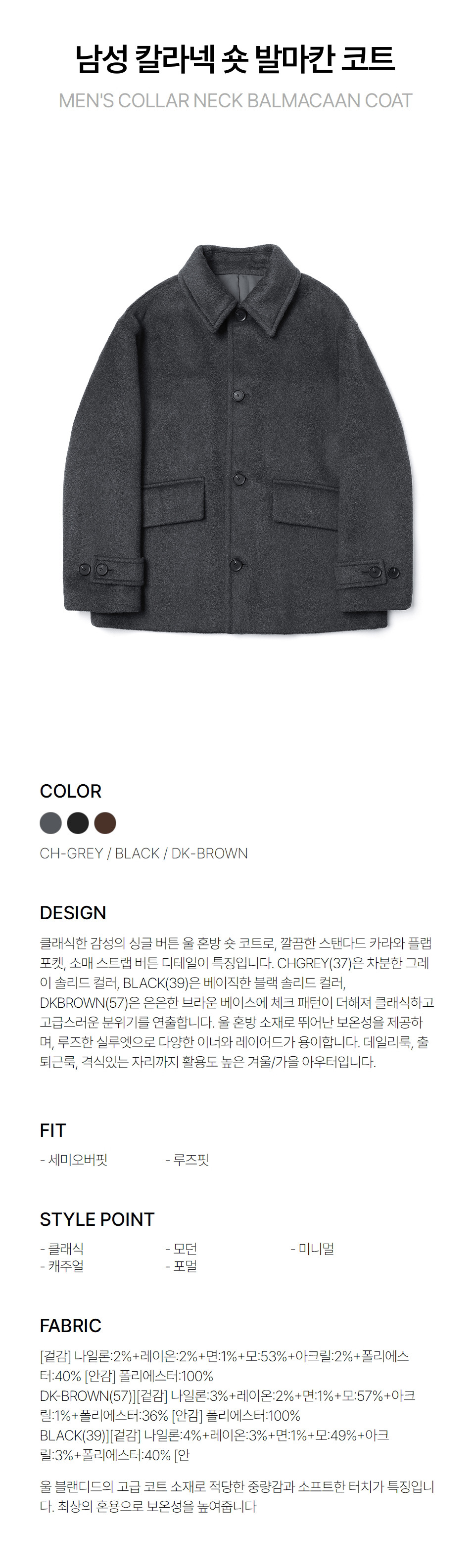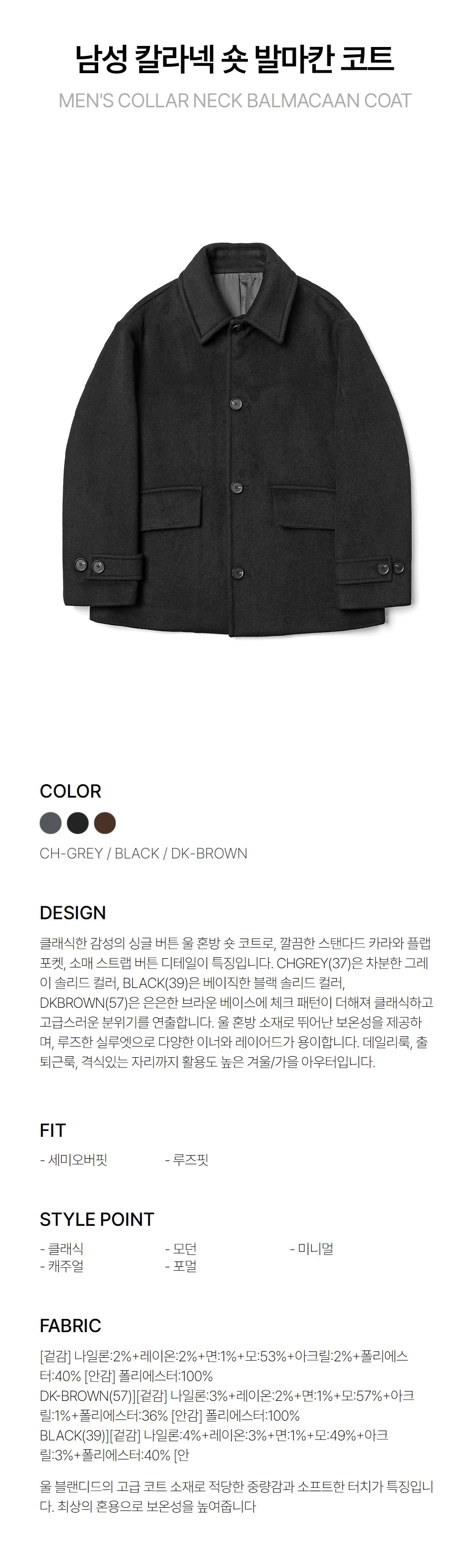 남성 칼라넥 숏 발마칸 코트(HBAHC14) 3color