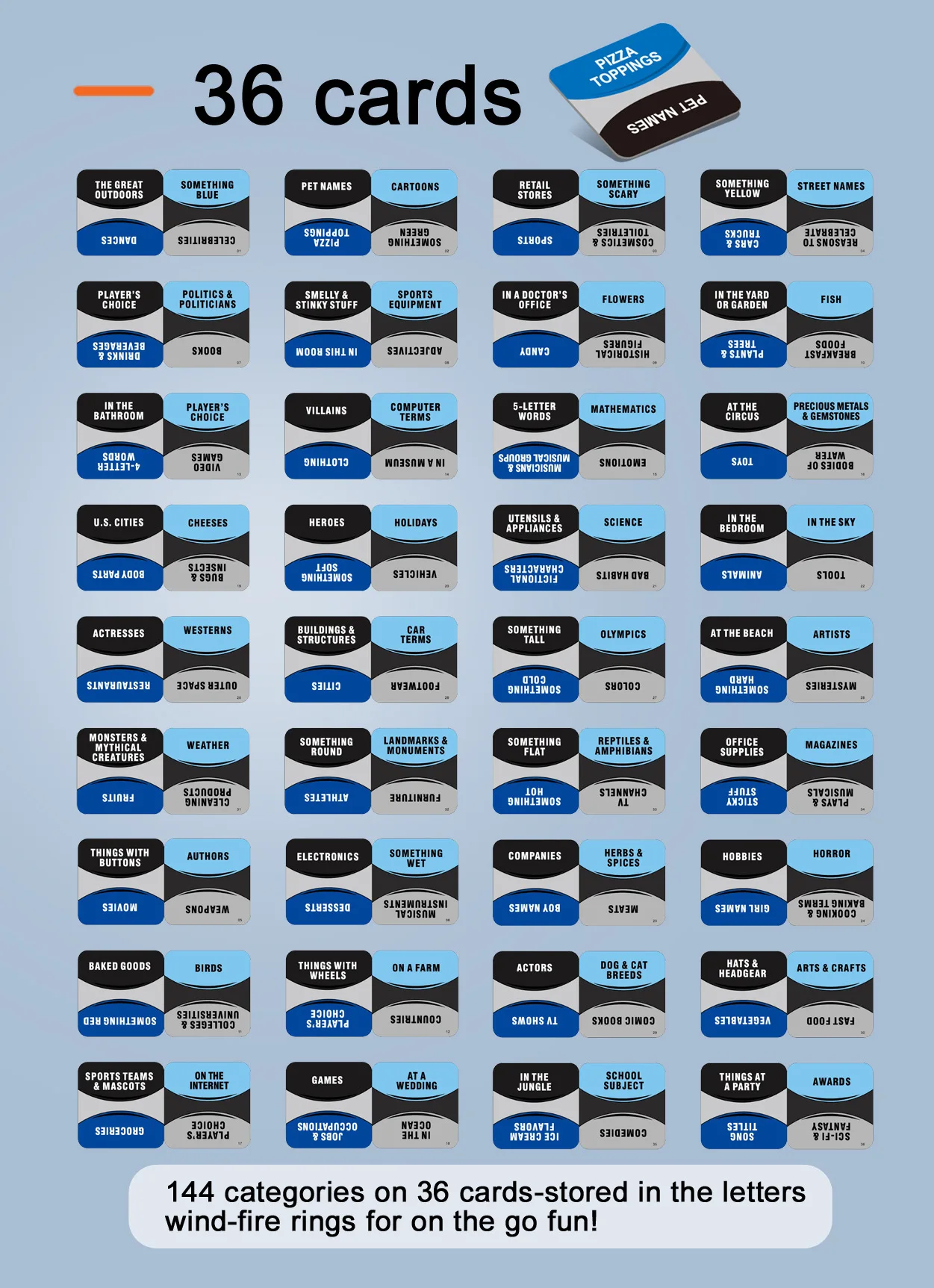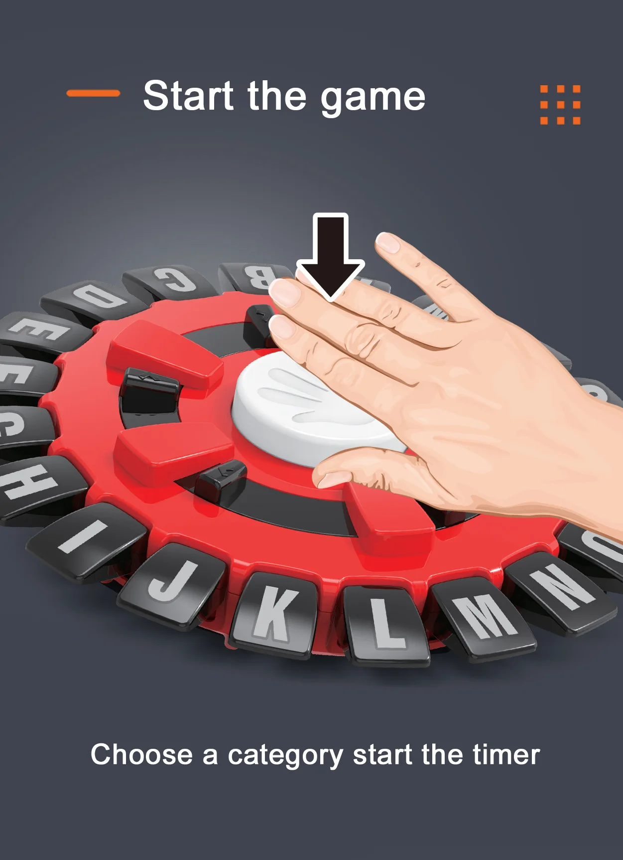 휴대하기 쉬움: 테이블 단어 게임으로 학습의 즐거움을 높이십시오. 휴대용 휠은 모든 카테고리 카드를 안전하게 수납하여 어디에서나 엔터테인먼트 및 교육을위한 쉬운 운반 및 구성을 보장합니다.