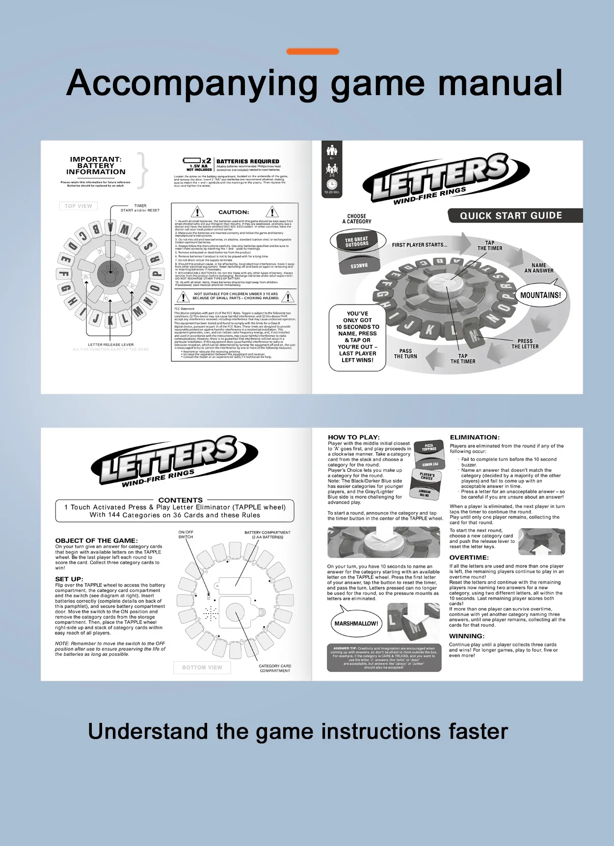 기술 향상: 이 테이블 단어 게임은 재미의 원천 일뿐만 아니라 플레이어가 시간이 다 떨어지기 전에 올바른 단어를 찾기 위해 열심히 경쟁하면서 언어 능력을 선명하게하고 빠른 사고를 촉진합니다. 혁신적인 흥분으로 가족의 밤을 향상시킵니다.