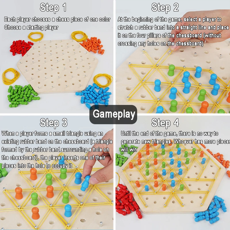 2. 각 턴마다 플레이어는 4 개의 못을 가로 질러 고무 밴드를 늘립니다. 삼각형을 완성 할 때마다 토큰 중 하나를 사용하여 삼각형을 자신의 것으로 주장 할 수 있습니다.