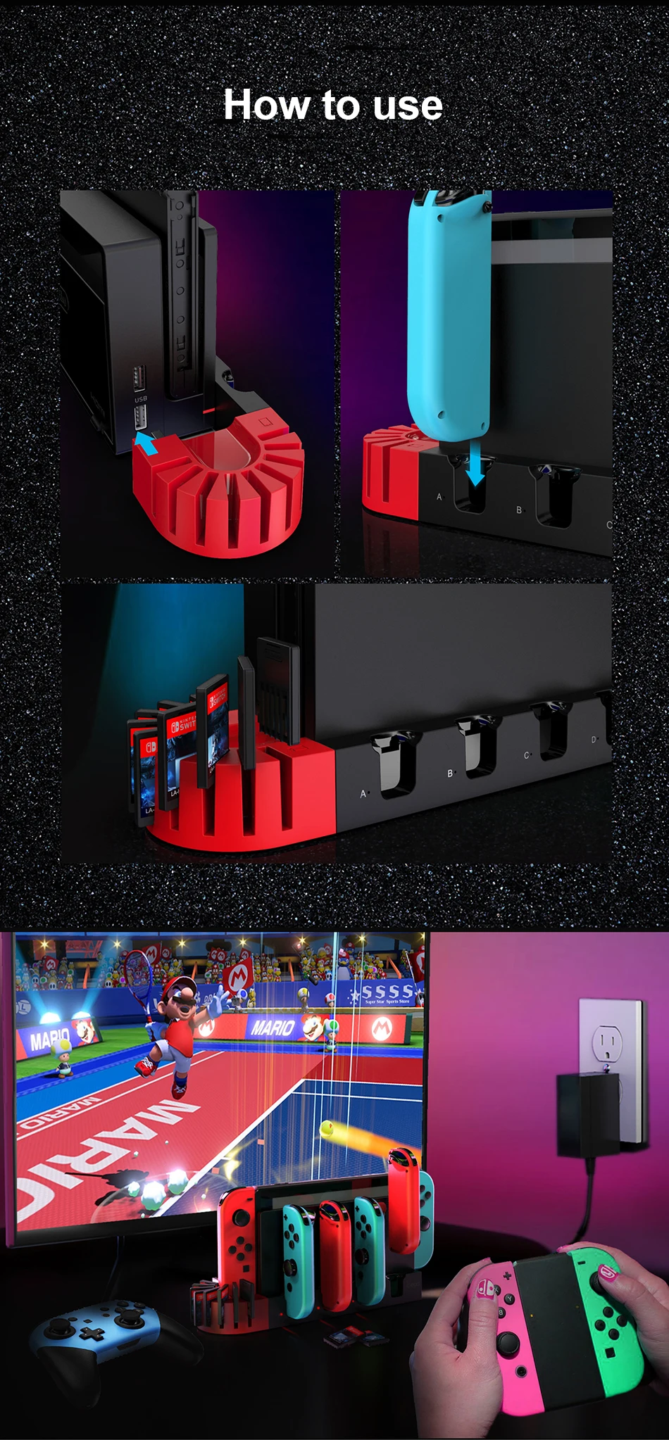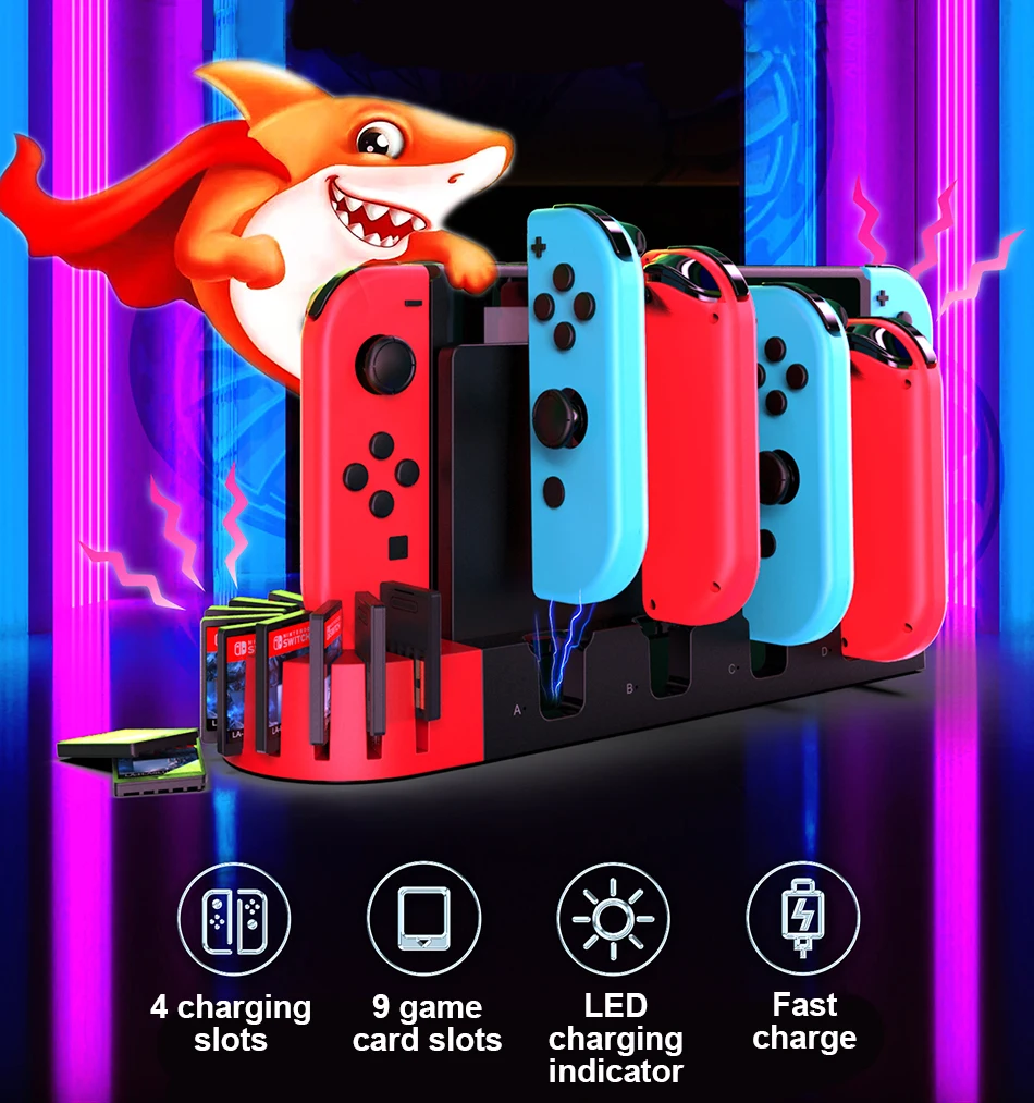 1. 이 충전기는 N-S Joy-con을 충전하는 데 사용되는 원래 N-S Dock 베이스와 함께 제공됩니다.