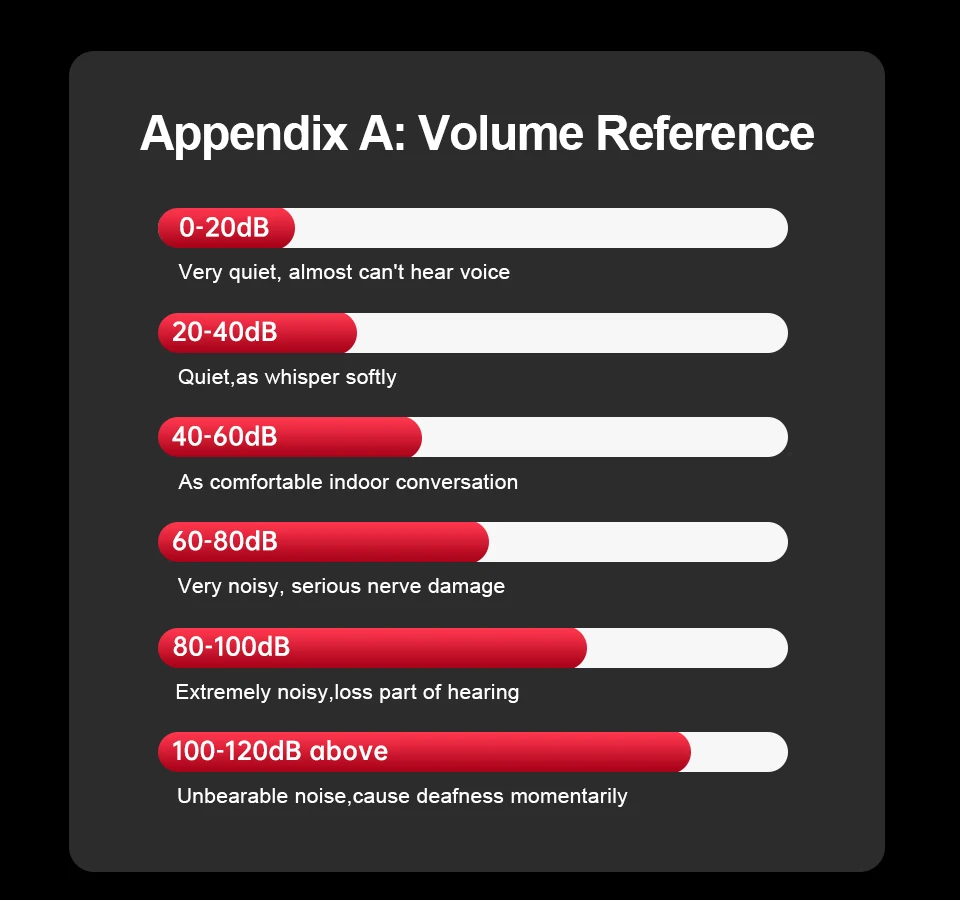 100-120dB: 견딜 수없는 소음, 잠시 청각 장애 발생/120dB 이상 완전히 청각 장애 또는 완전히 돌이킬 수없는 청각 장애: