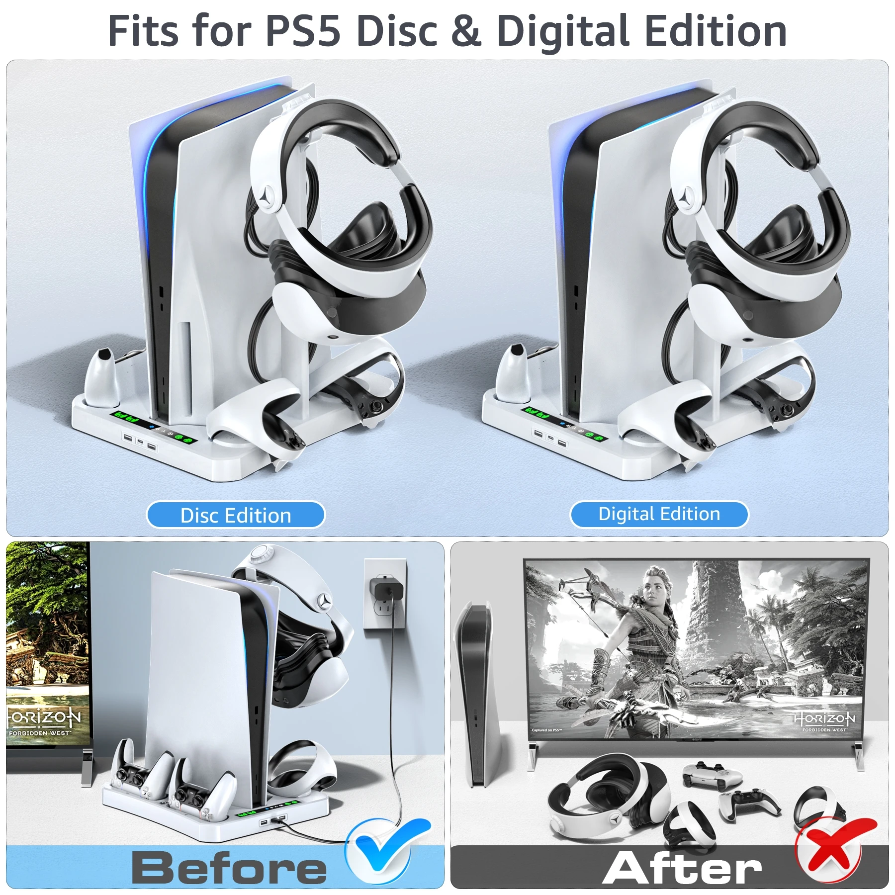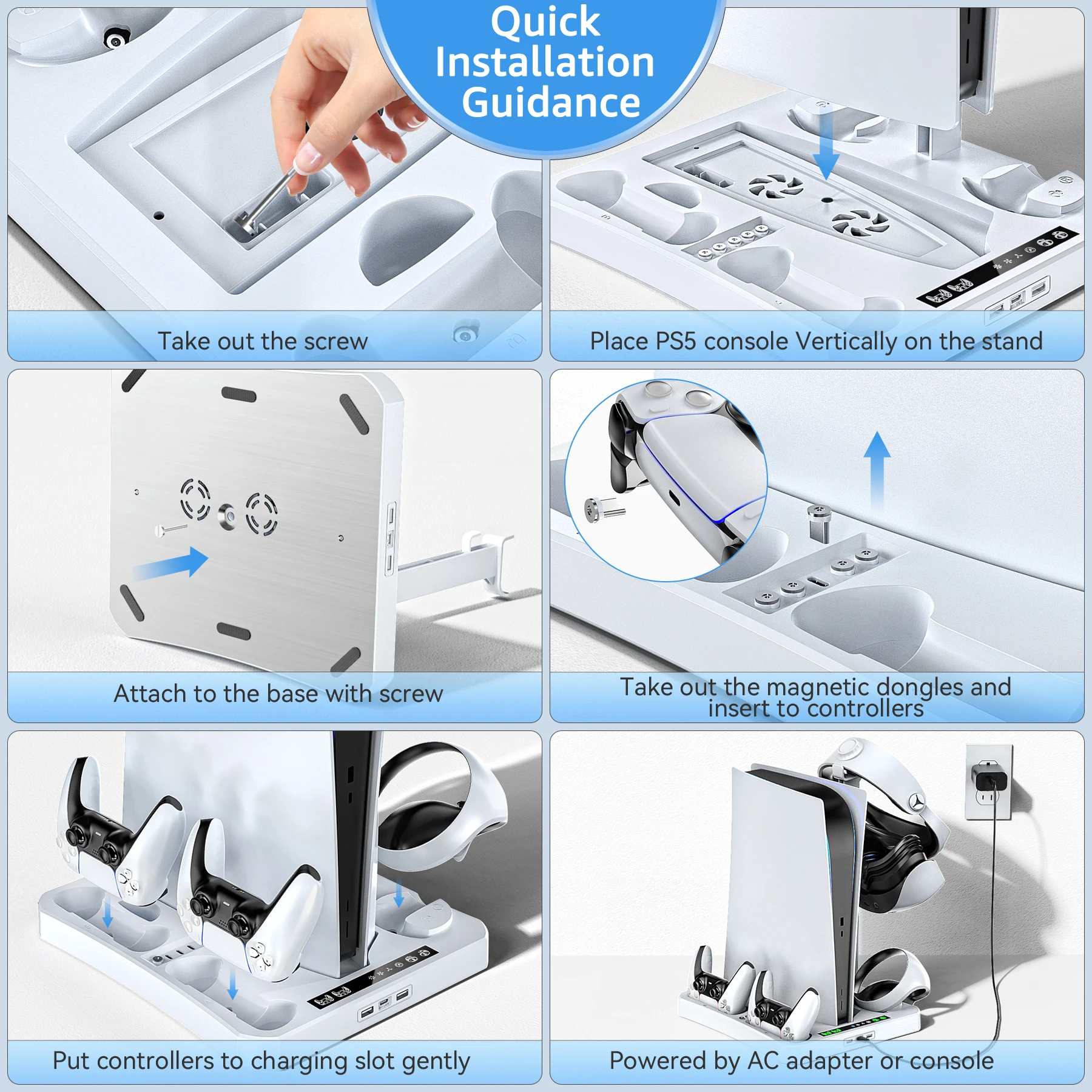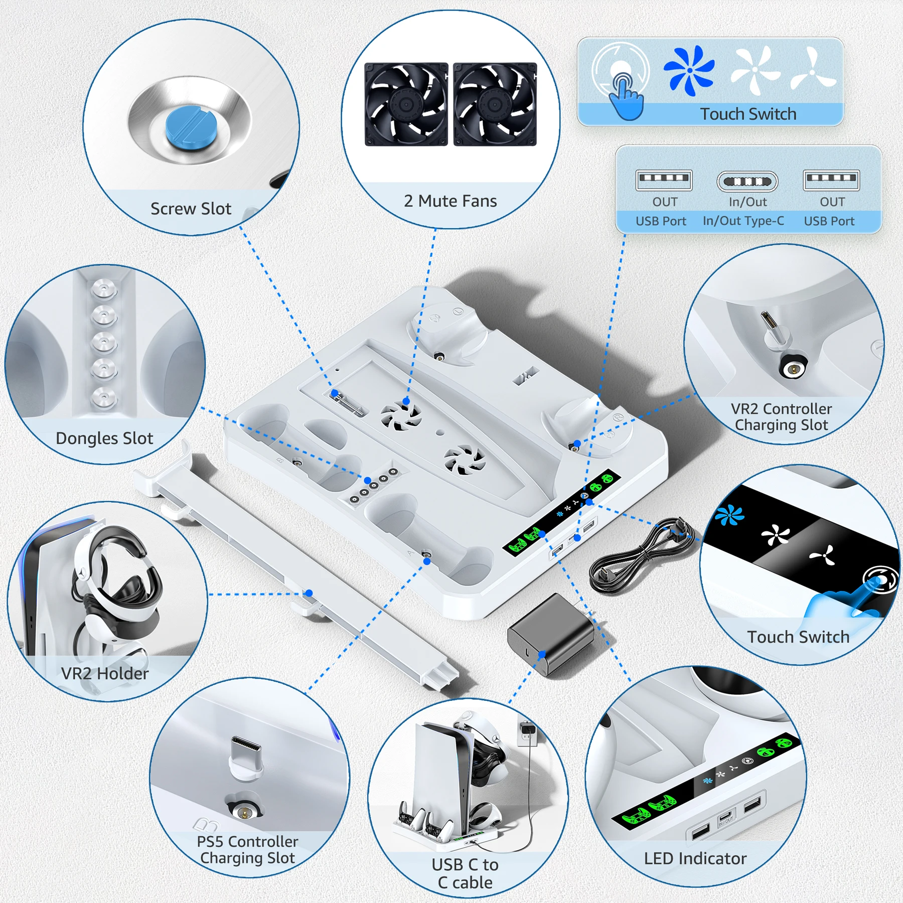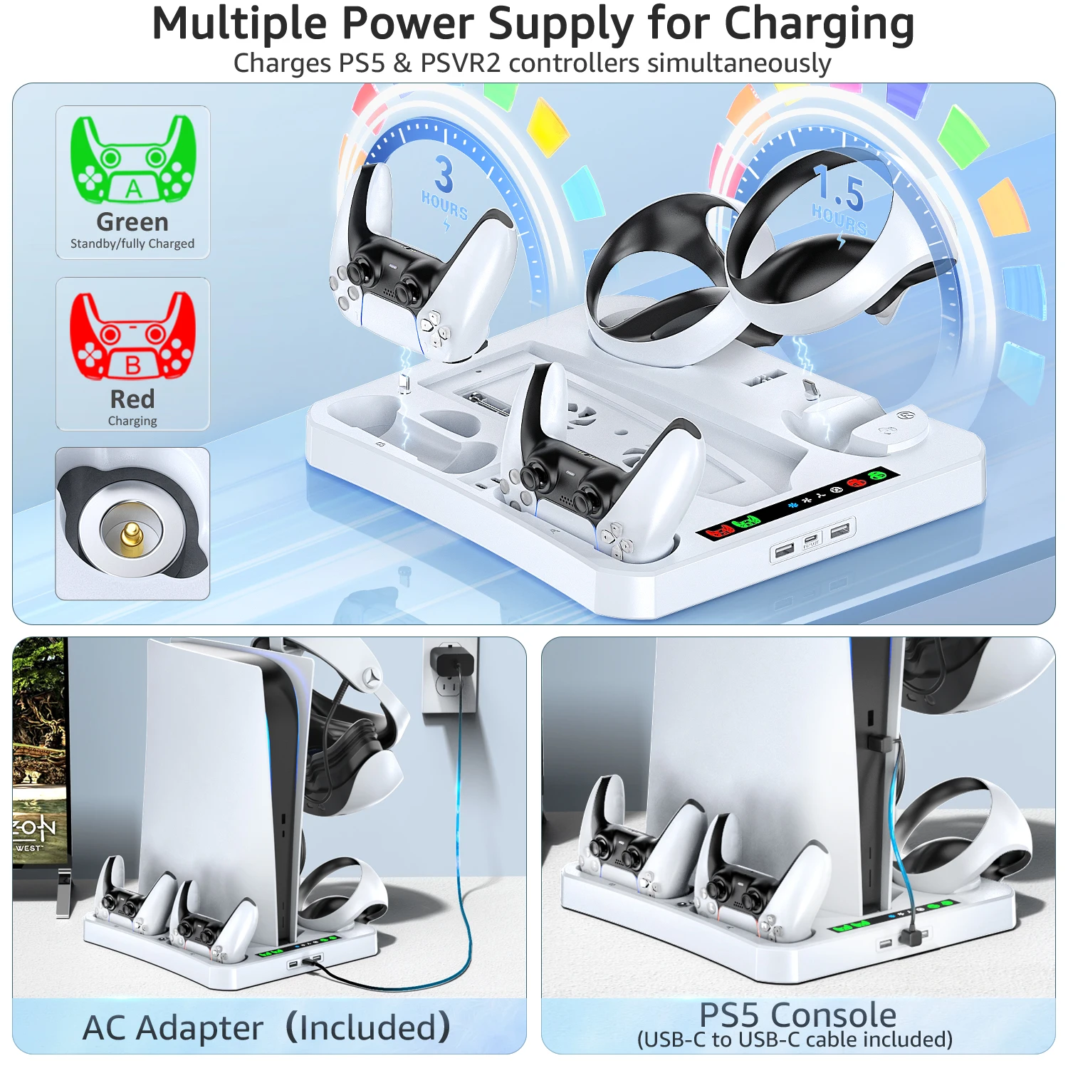 VR PS5 및 PS VR2 충전 스테이션 AC 어댑터 및 3 단계 냉각 선풍기 PS5 및 PSVR 2 컨트롤러 충전기 도크