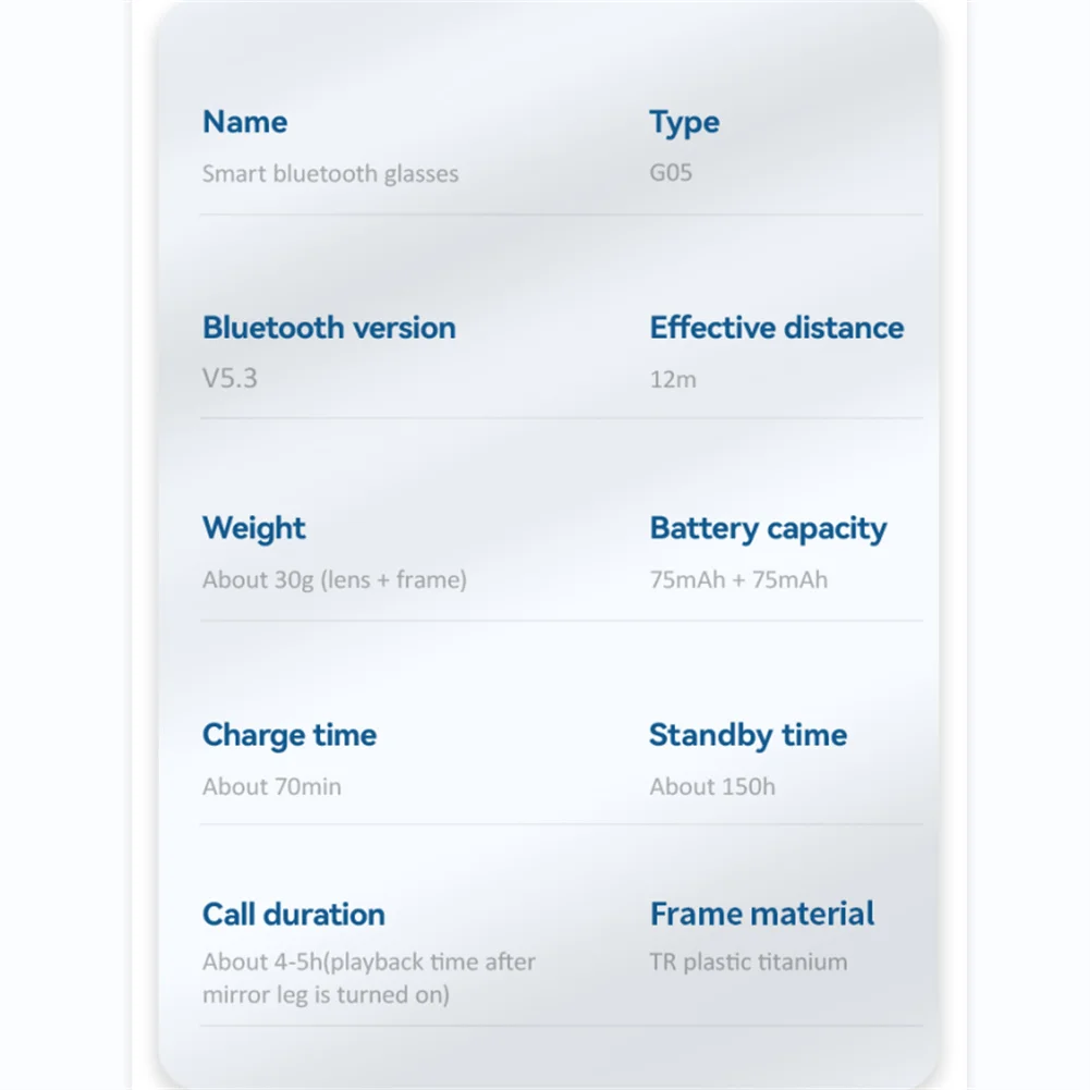 VR 남녀공용 스마트 안경 무선 선글라스 이어 헤드셋 방수 핸즈프리 통화 선글라스 G05 스마트안경