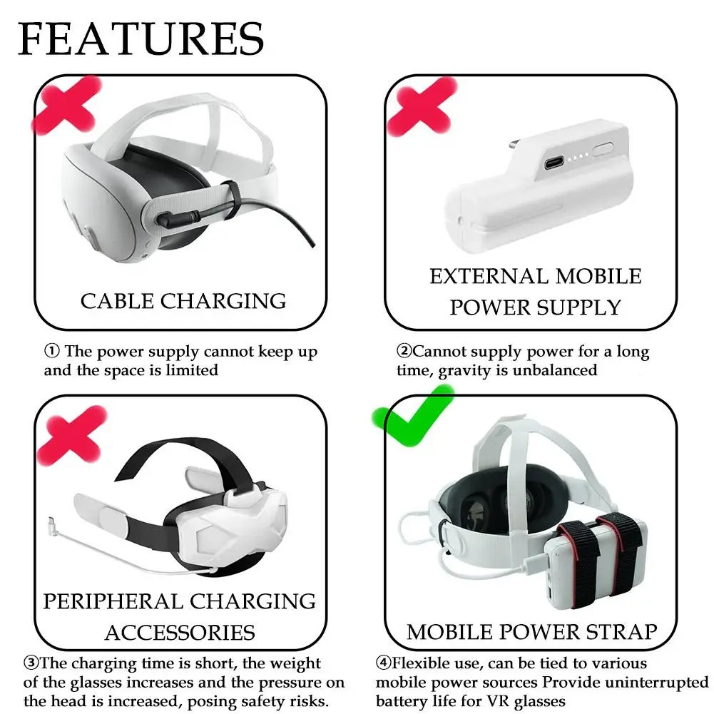 메타퀘스트 3 오큘러스 퀘스트 2 용 배터리 스트랩 VR 안경용 조정 가능 모바일 전원 고정 벨트 수명 S2M7
