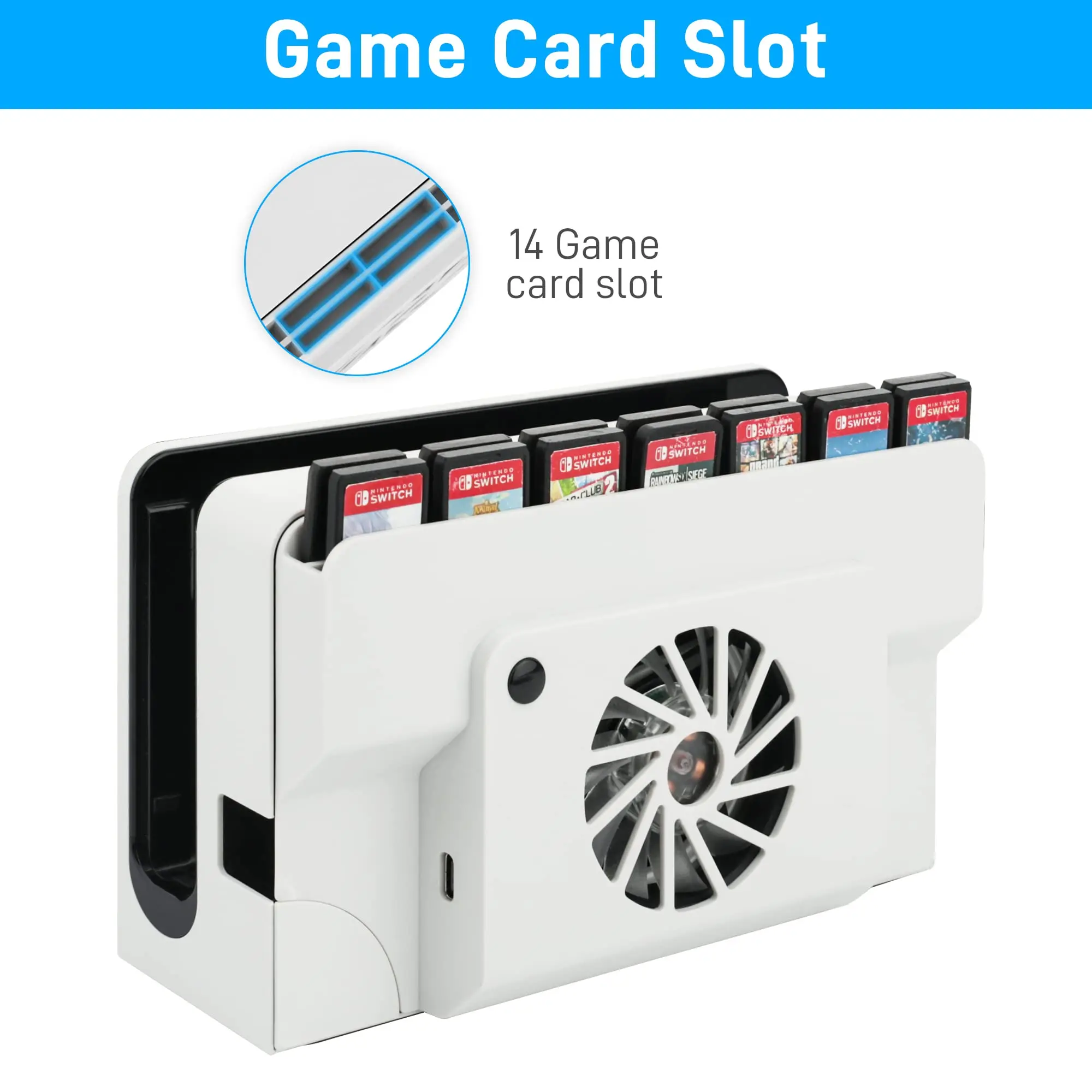 • 게임 카드 슬롯: 도크 팬 쿨러에는 상단에 14 개의 게임 카드 슬롯이있어 게임 카드를 저장할 수 있습니다. 더 이상 게임 카드 케이스를 항상 뒤적 거리지 마십시오.