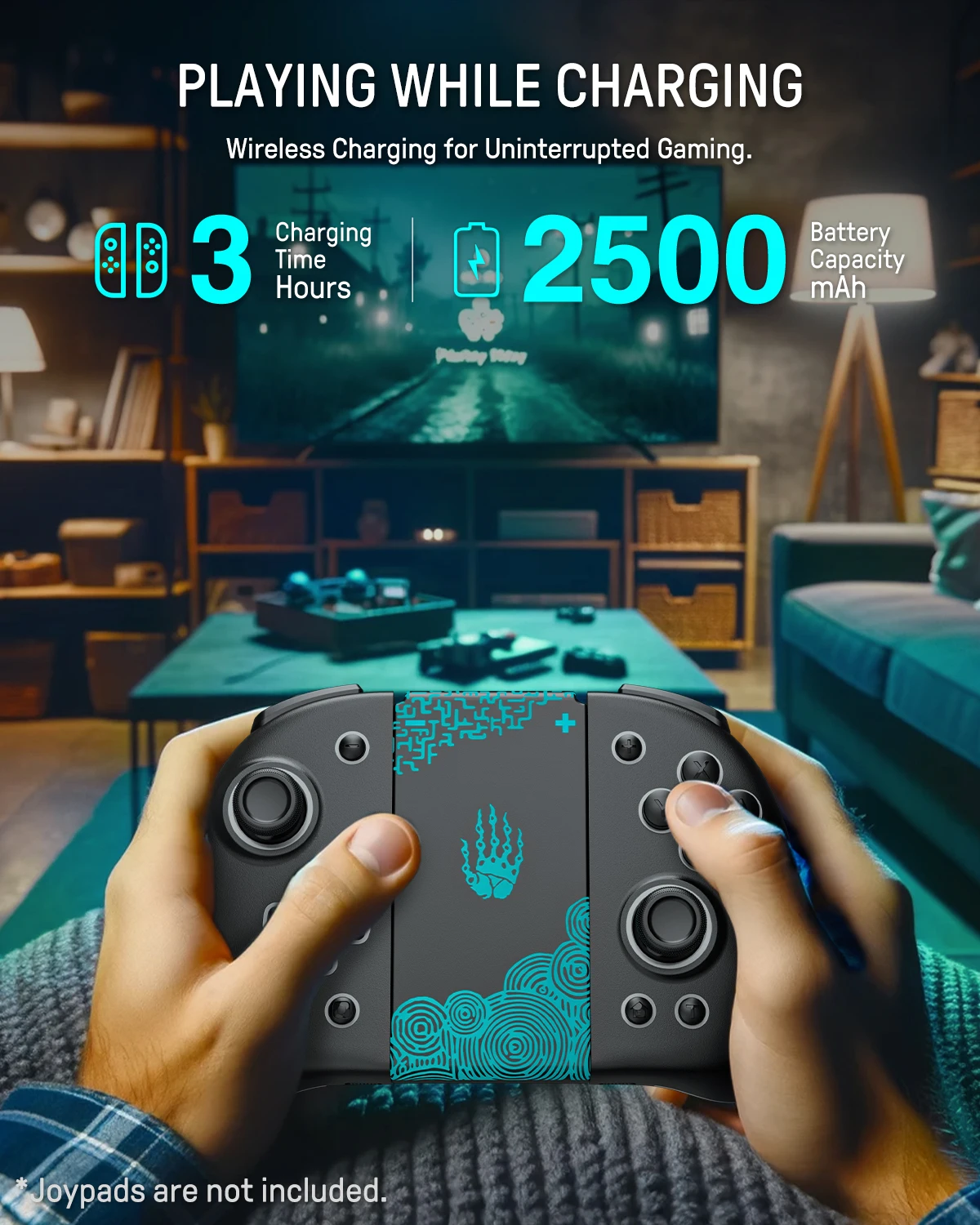 충전 중 게임: 충전 그립은 편리한 이동 중 충전을 위해 2500mAH 내장 배터리를 갖추고 있습니다. 무선 충전으로 게임 중에도 충전할 수 있으며, 완전히 충전하는 데 2.5-3 시간이면 중단없는 게임 플레이를 즐길 수 있습니다.