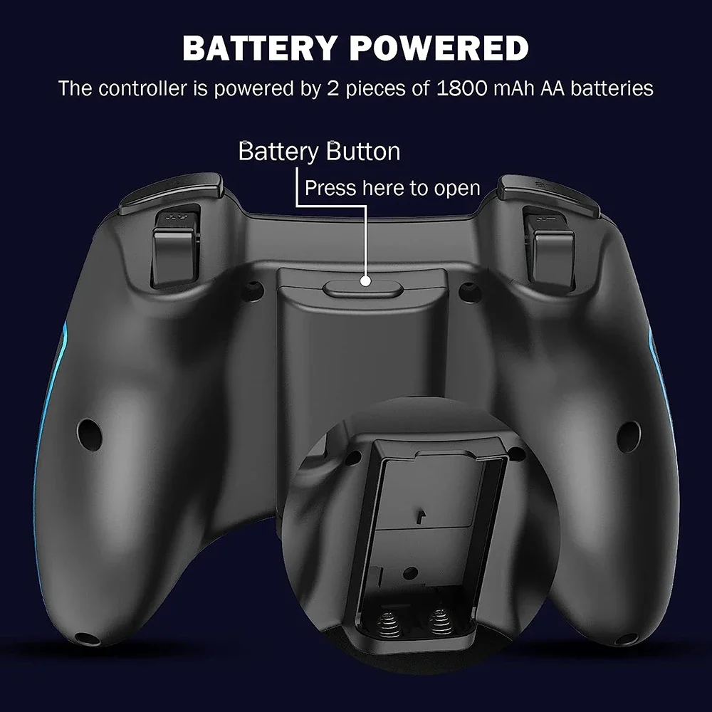 컨트롤러는 2 개의 AA 배터리로 작동하므로 게임 패드가 최대 20 시간 동안 작동 할 수 있습니다. 배터리가 패키지에 포함되어 있지 않습니다.