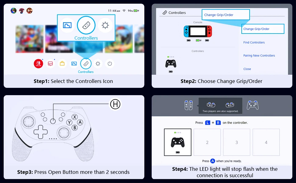 호스트와 컨트롤러는 잠자기 후 다시 연결할 수 있으며 "H" 를 2 초 동안 길게 누르면 4 개의 표시등이 5 초 동안 천천히 깜박여 자동으로 호스트에 다시 연결됩니다.