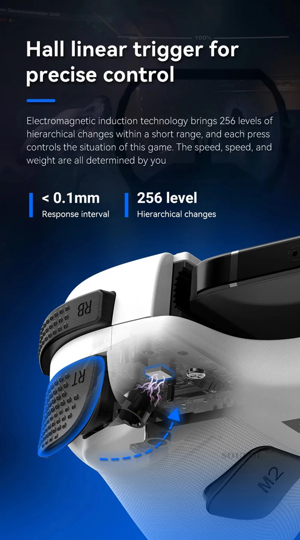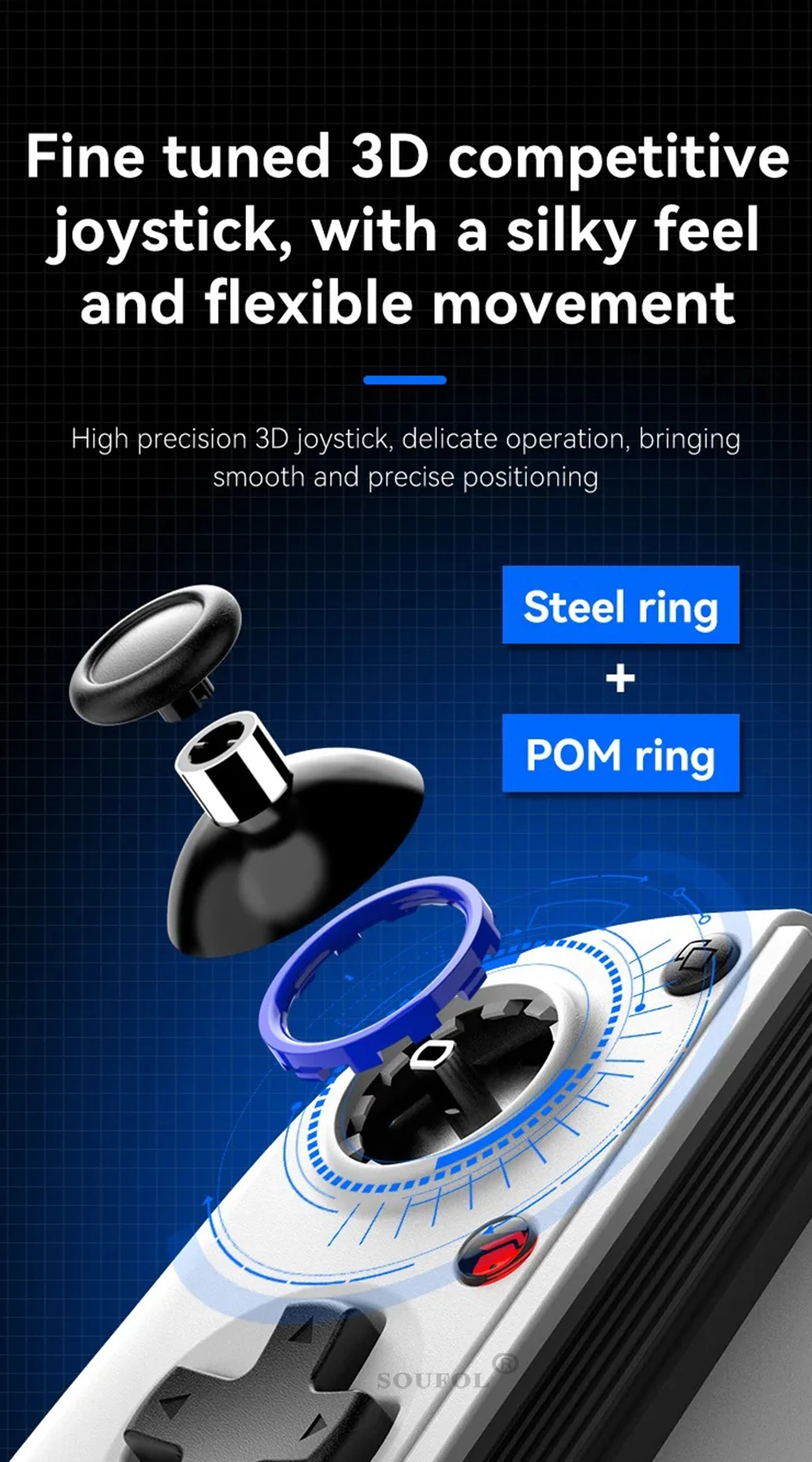 2. 홀 선형 트리거, 정밀 제어; 미세 조정 3D 경쟁 로커 (스틸 링 + POM 링), 부드럽고 유연한 위치 느낌; 전도성 접착 기능 버튼, 빠른 트리거; 결합 된 크로스 키, 즉시 변환을 제어하고 플레이어의 게임 경험을 향상시킵니다.