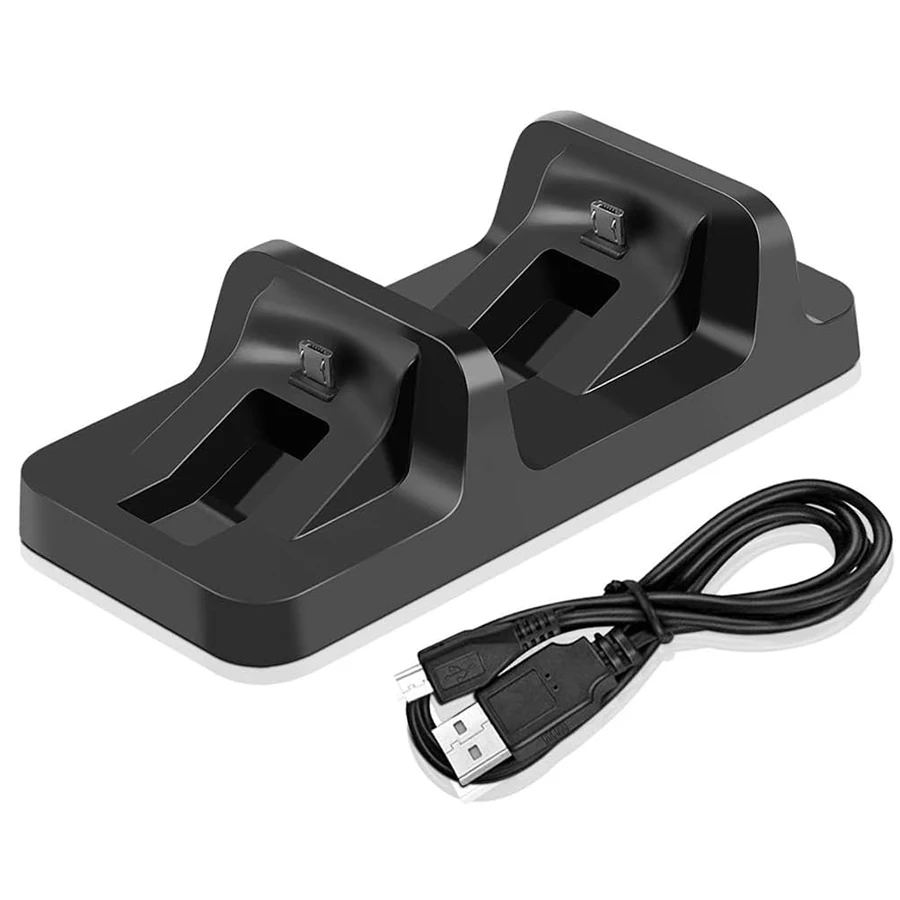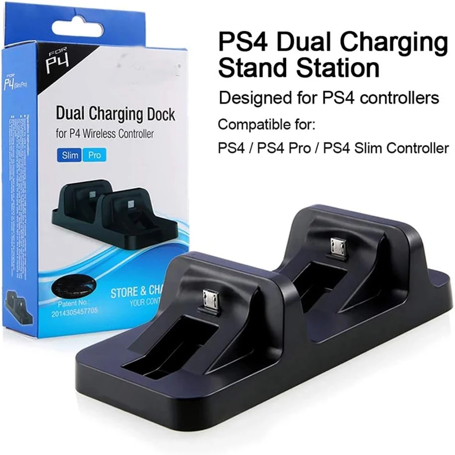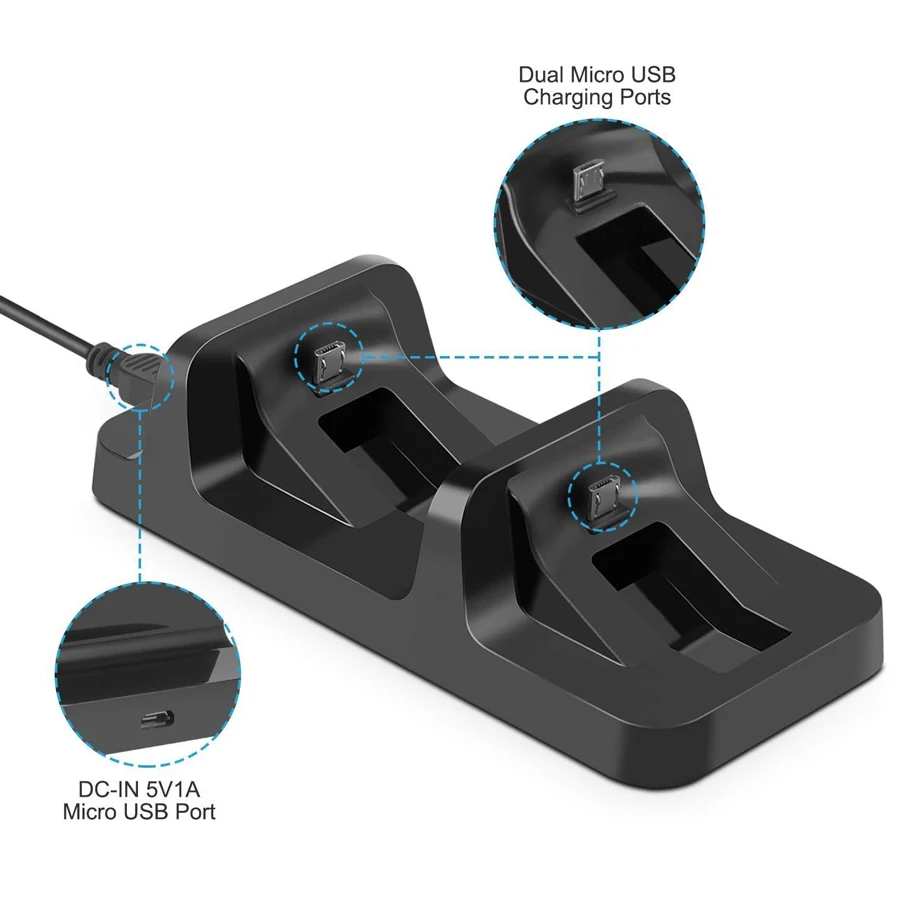 듀얼 마이크로 USB 포트-PS4 시스템에 연결하지 않고도 두 개의 PS4 컨트롤러를 동시에 충전 할 수 있습니다. 안정적인 균형을 보장하는 4 개의 미끄럼 방지 접착제로 충전 도크가 잘못 이동하는 것을 방지합니다.