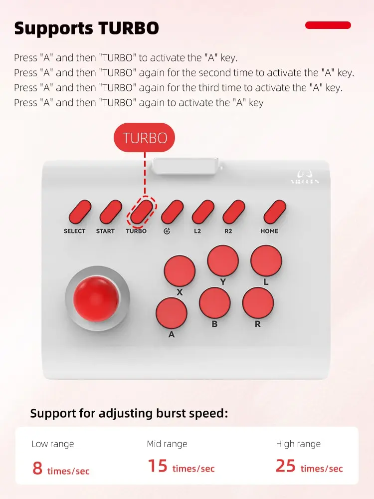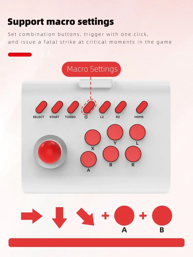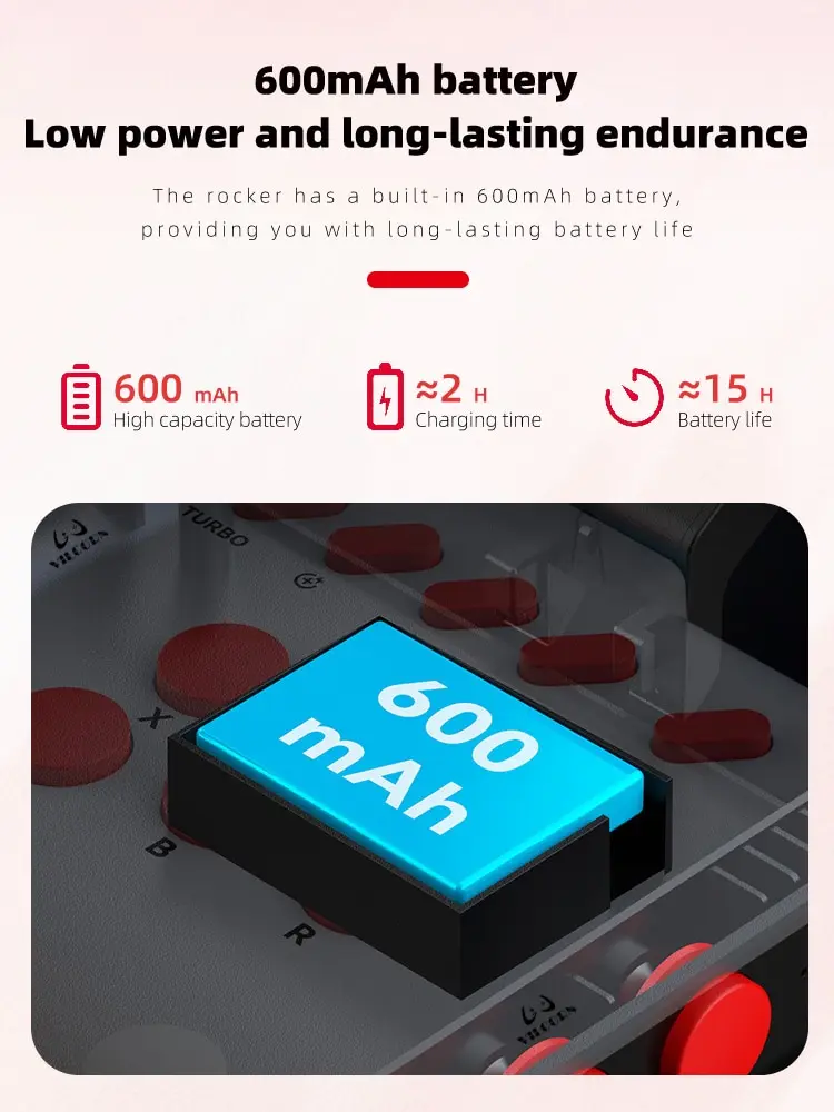 낮은 전력 소비: 조이스틱은 600mAh 배터리, 낮은 전력 소비 및 오래 지속되는 배터리 수명을 갖추고 있으며 매크로 설정을 지원합니다. 게임에서 중요한 순간에 상대를 KO시킬 수있는 원 클릭 버튼 콤보가 있습니다.