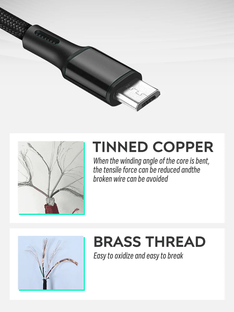 주석 도금 구리와 나일론 와이어 기술을 사용하여 와이어 코어가 나일론 와이어 주위에 비스듬히 감겨 있으면 와이어 파손과 산화로 인한 느린 충전을 피할 수 있습니다.