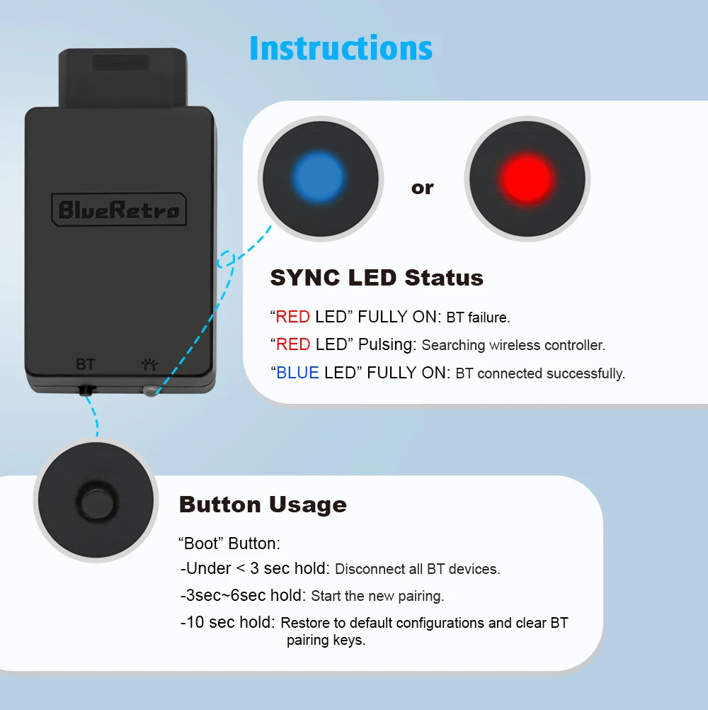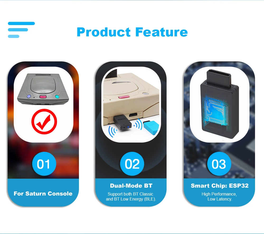 Blueretro 어댑터는 Sega Saturn 콘솔 용 싱글 플레이어 Bluetooth 호환 무선 컨트롤러 어댑터로 Wii, Switch, , PS4, PS5 와 같은 블루투스 호환 컨트롤러를 연결할 수 있습니다. Xbox One, Xbox 시리즈 X | S,8bitdo 등. 장치.