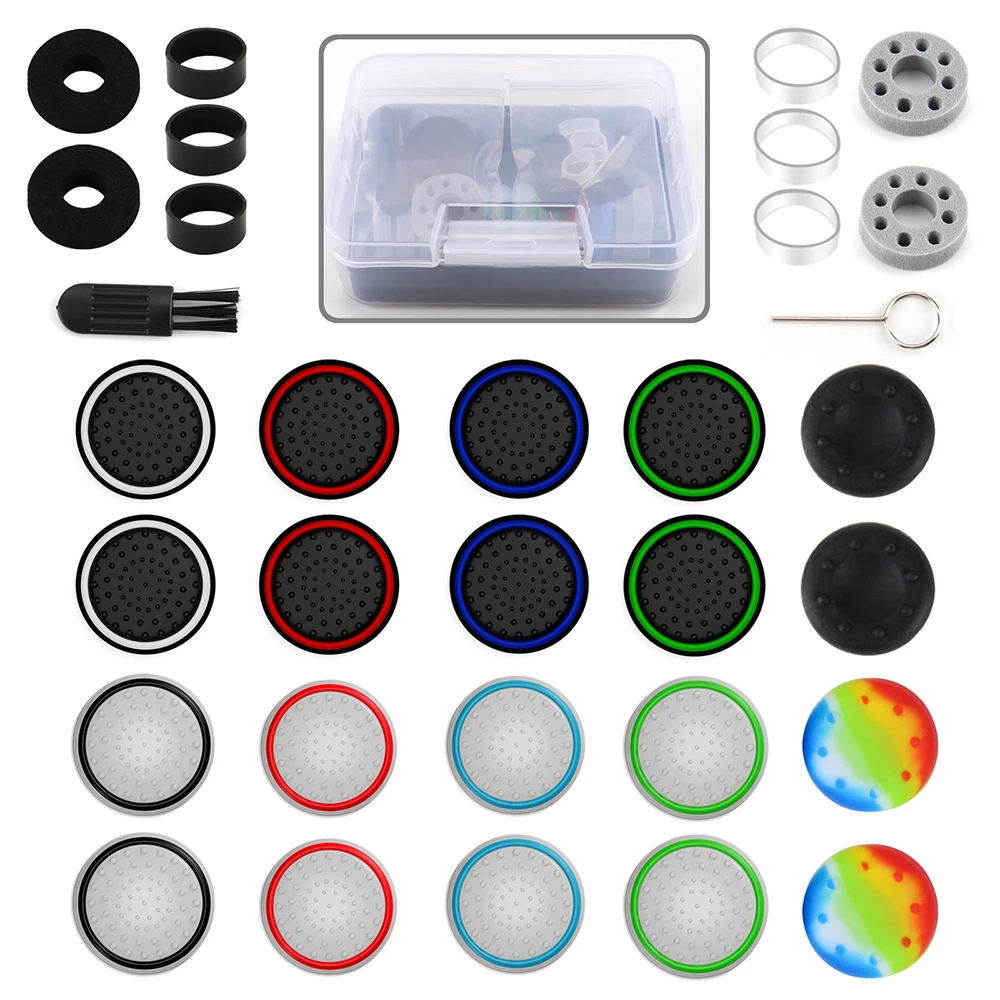【 32 피스 컨트롤러 그립 세트 】 컨트롤러 그립 20 개, 어시스트 링 6 개 (검정 3 개 및 회색 3 개), 정밀 링 6 개 (검정 3 개 및 투명 3 개) 가 포함되어 있습니다.