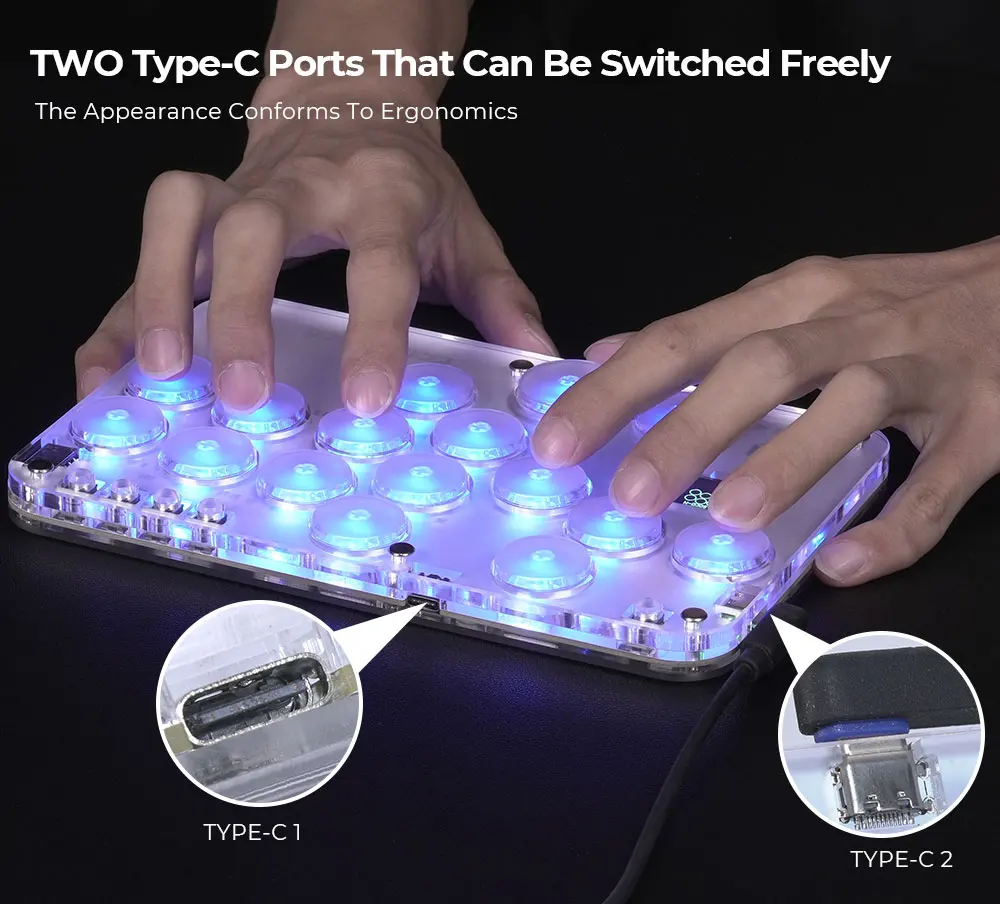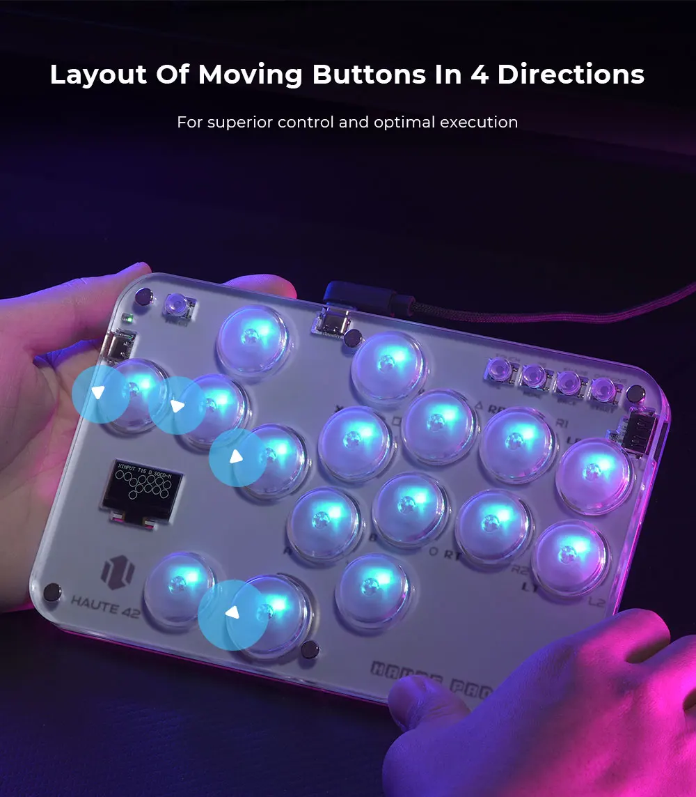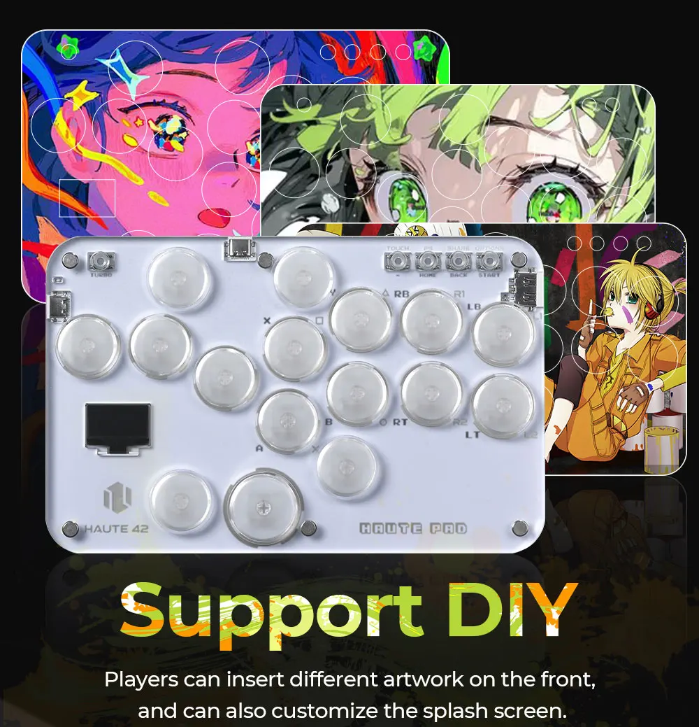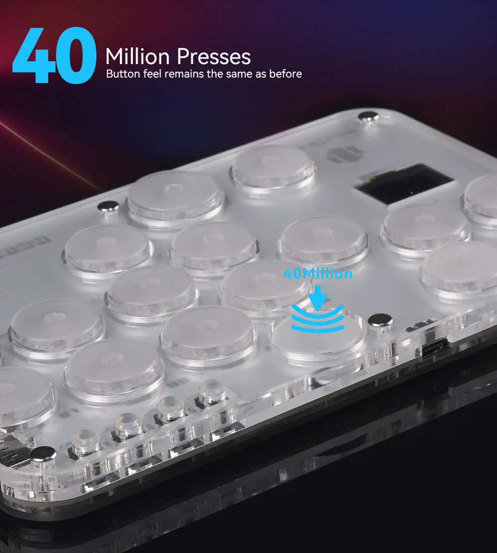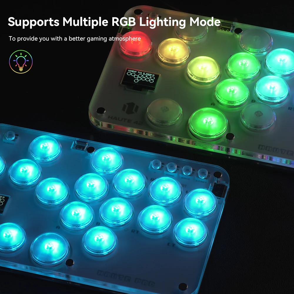 RGB 조명 효과가있는 투명한 릴 소재, 16 개의 버튼이있는 미니 히트 박스 스타일의 아케이드 키보드로 편안한 느낌을 제공하고 격투 게임을 즐길 수 있습니다. 구매자는 자신 만의 히트박스 스킨을 만들어 컨트롤러를 더 시원하고 개인화되도록 만들 수 있습니다