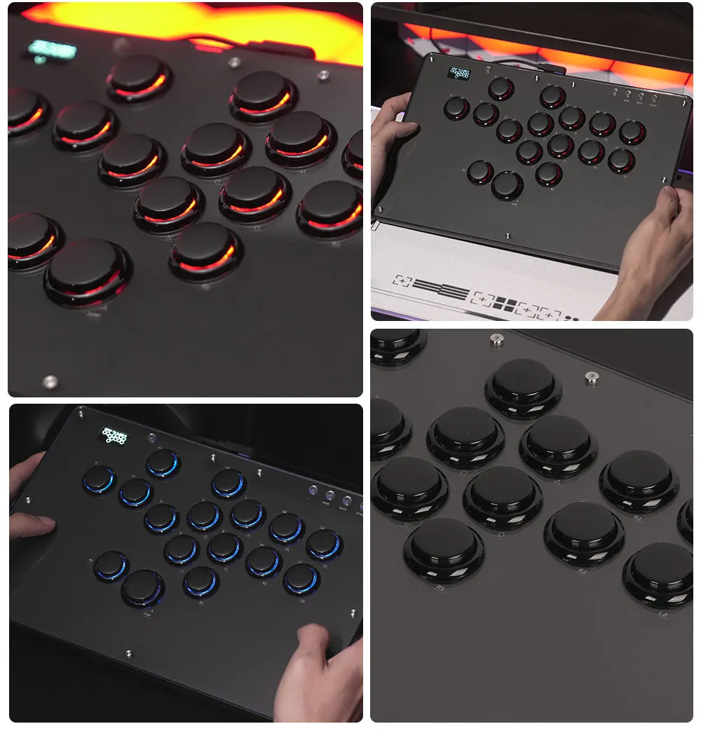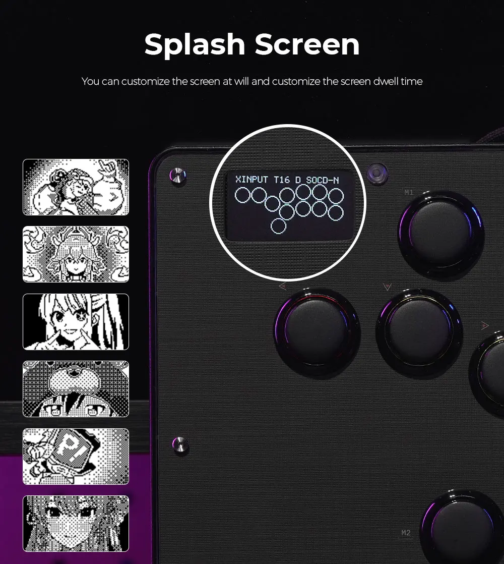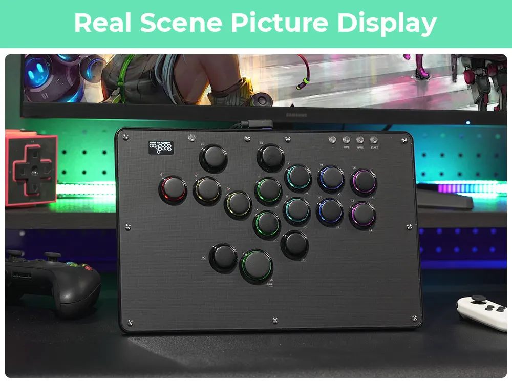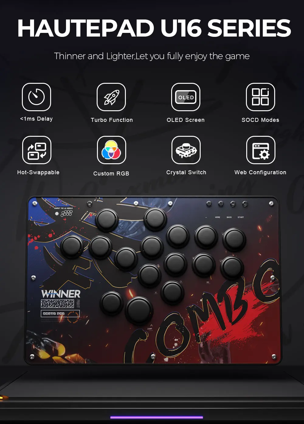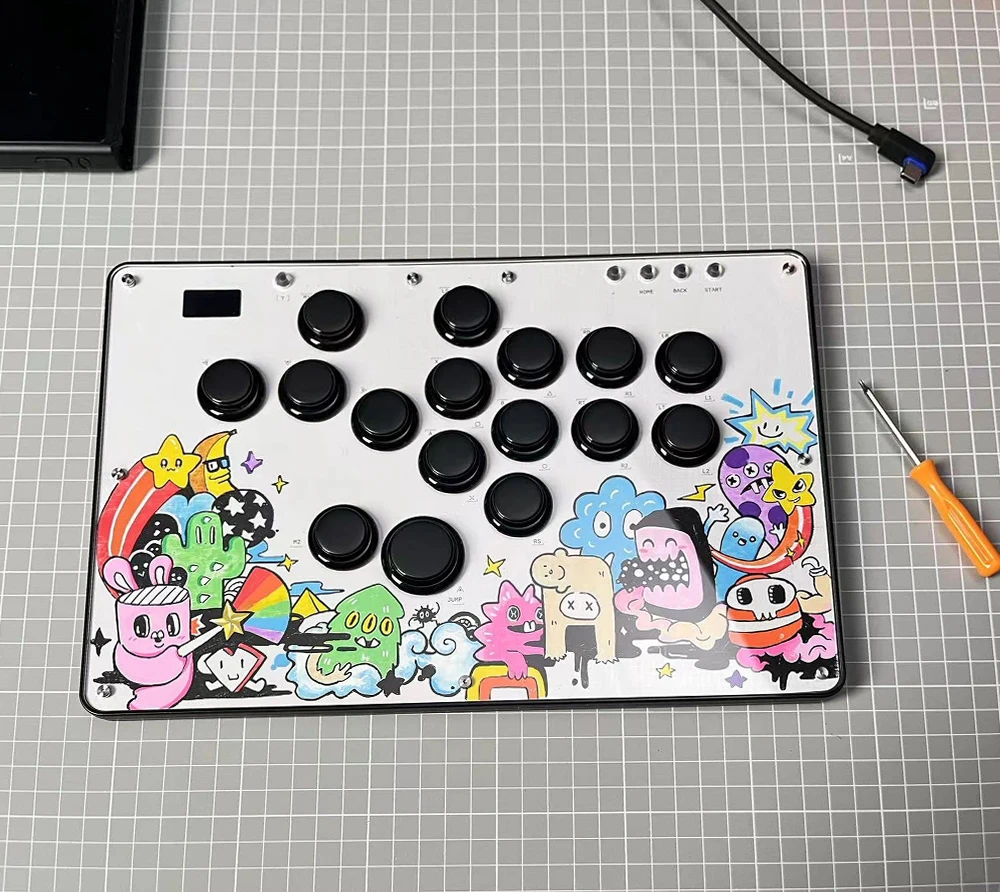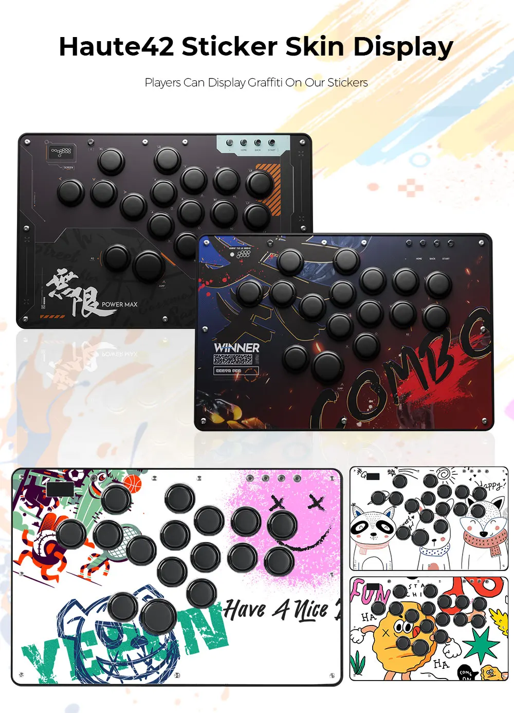 U16 은 가볍고 얇은 PC 소재를 채택합니다. 컨트롤러에는 레트로 아케이드 느낌과 RGB 조명 효과가있는 버튼 림이 있습니다. 이번에 우리 제품에는 4 개의 DIY 패널 용지가 있으며 플레이어는 빈 패널에 낙서를 하여 자신 만의 히트 박스 컨트롤러를 만들 수 있습니다!