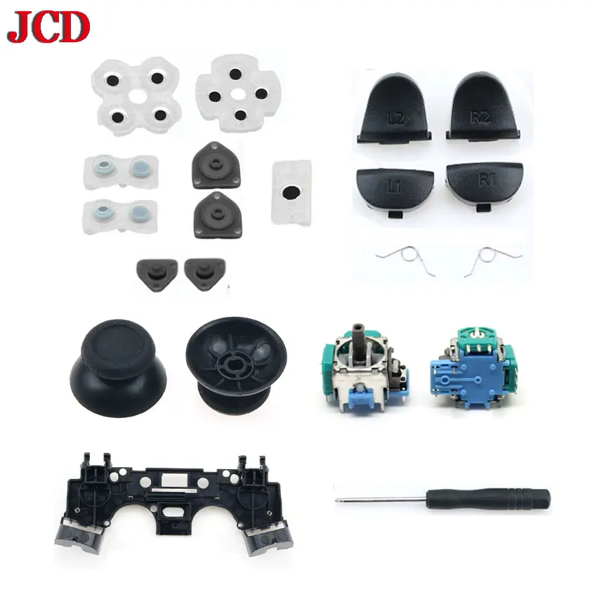 JCD 1 세트 PS4 컨트롤러 수리 세트 L1 R1 L2 R2 트리거 버튼 3D 아날로그 조이스틱 엄지 스틱 캡 전도성 고무 드라이버 키트
