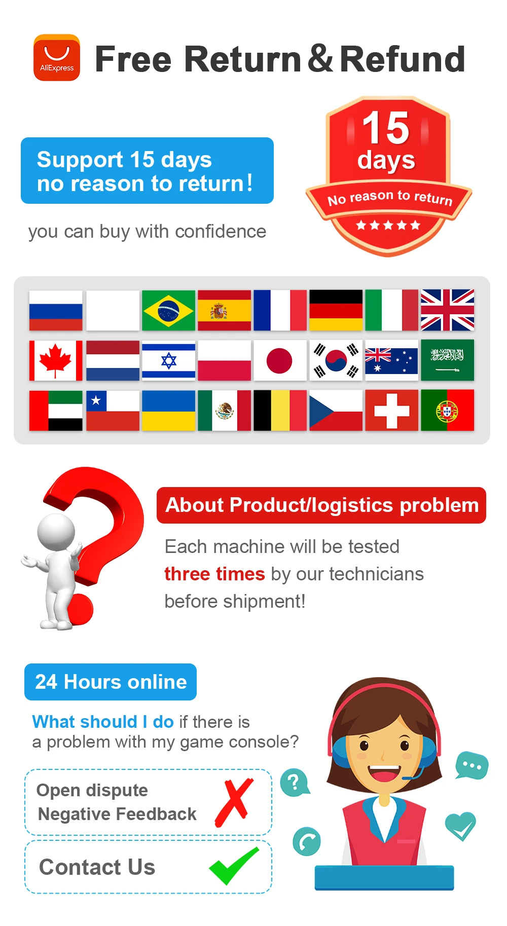 러시아, 미국, 스페인, 프랑스, 브라질, 네덜란드, 이스라엘, 폴란드, 영국, 한국, 독일, 이탈리아, 캐나다, 호주, 사우디 아라비아, 칠레, 우크라이나, 일본, 멕시코, 벨기에, 체코 공화국, 스위스, 포르투갈 등 24 개국에서 번거롭지 않은 반품 보증.