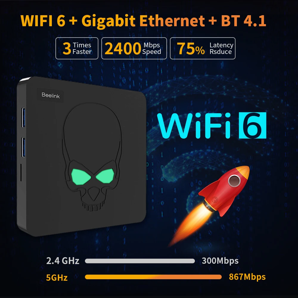 쿼드 코어 암 Cortex-A73 및 듀얼 코어 암 Cortex-A53 프로세서를 포함하여 가장 강력한 Amlogic S922X hexa-core soc을 왕 Beelink GT KING-hyper베이스, 초고속 실행 속도와 부드러운 이미지 처리 성능을 제공하고, 기가비트 네트워크 포트를 지원하며, gpu는 픽셀 충전 속도 성능과 FP32 성능에 슈퍼 컴퓨팅 성능을 갖춘 암 Mali-G52 MP6 을 채택합니다.