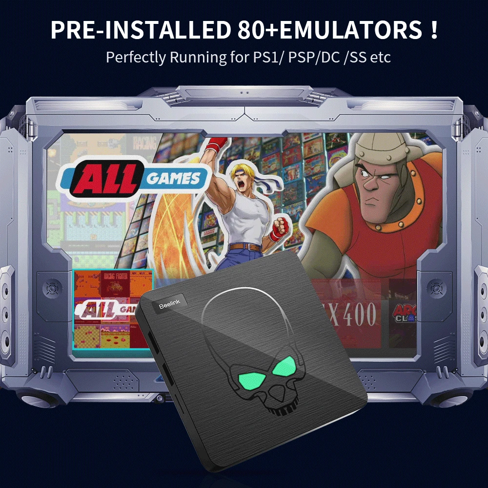 GT king은 최신 EmuELEC 4.6 시스템, 사전 설치된 70 + 에뮬레이터, 512gb 내장 50,000 게임 (반복 없음), PS1/PSP/N64/NDS/DC/MAME/Naomi/Sega Saturn 등, 고전 게임, 아케이드 게임, 스포츠, 싸움, 경주 등에 대한 완벽한 지원. 등