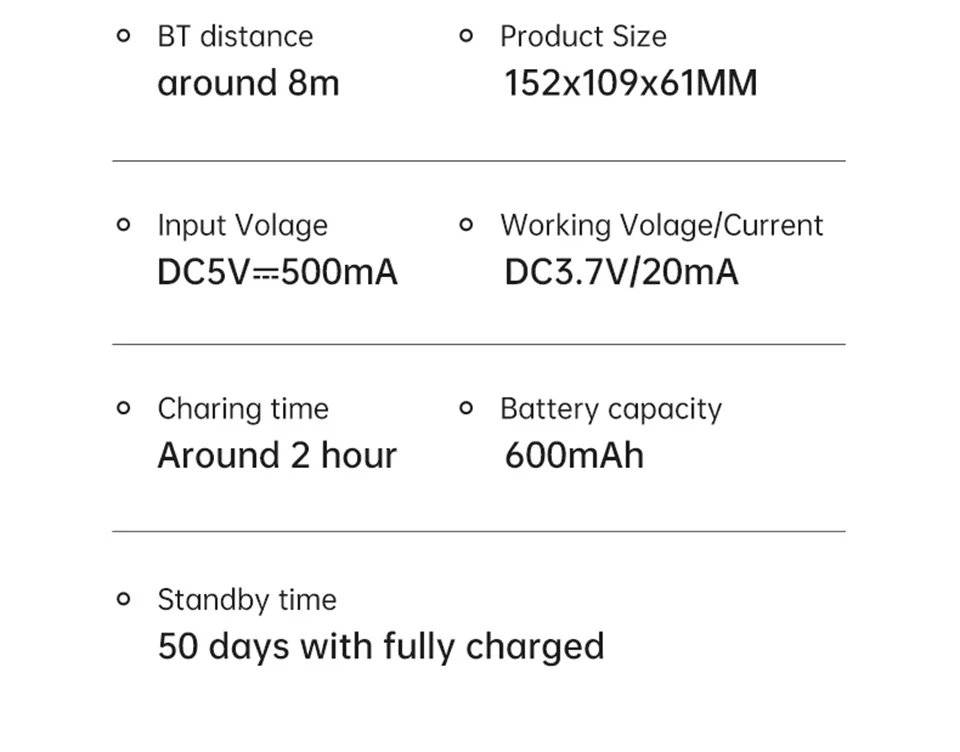 4) 연결: BT 4.0, 전송 거리: ≤ 8 미터