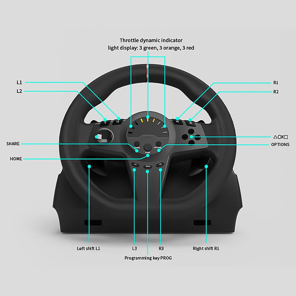 3. 홀 선형 센서 페달:홀 선형 센서 페달이 장착 된이 게임 스티어링 휠에는 스로틀 응답을위한 LED 디스플레이와 세 가지 조절 가능한 감도 수준이 있습니다. 접이식 디자인과 TPR 고무 코팅은 강렬한 게임 세션 동안 편안함과 미끄럼 방지 성능을 보장합니다.