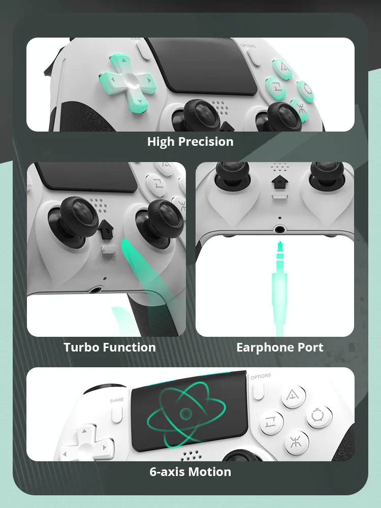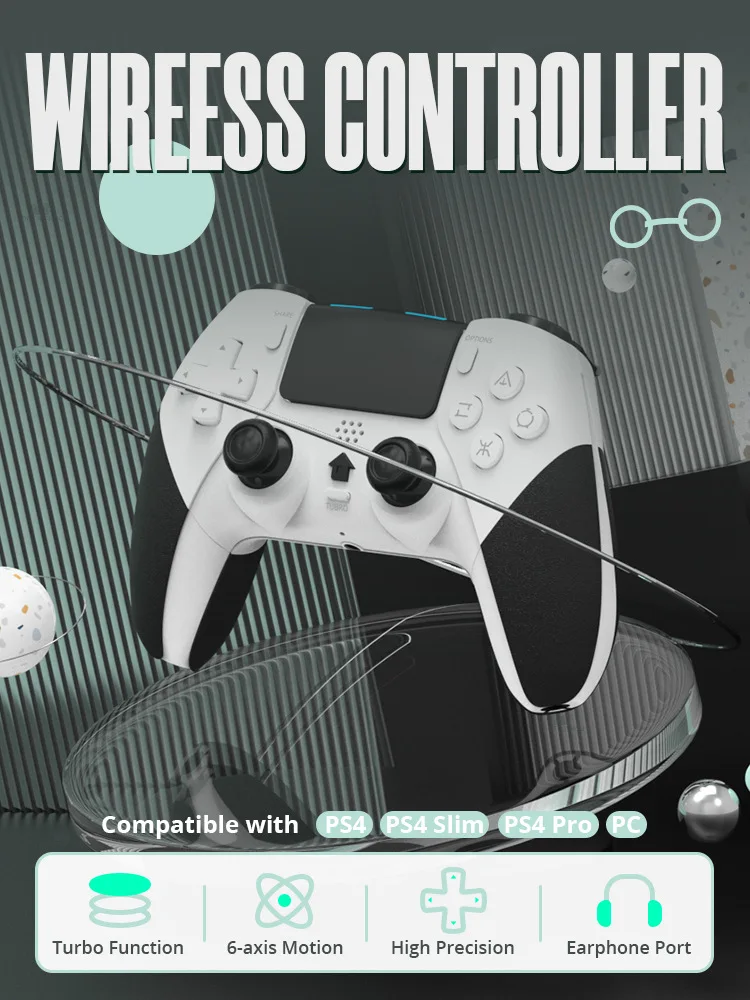 이 제품은 매크로 프로그래밍, 6 축, 진동, 터보 기능, 내장 800 배터리, 무선 블루투스 컨트롤러 (무선 블루투스 기술 사용) 가있는 PS4 컨트롤러입니다. 내장 터보 및 버튼 매핑 기능, 원격 제어, 쉬운 작동. PS4/PS4slim/PS4Pro 콘솔에 사용할 수 있으며 PS5 콘솔에서 PS4 게임 재생을 지원합니다 (PS5 게임은 지원되지 않음)