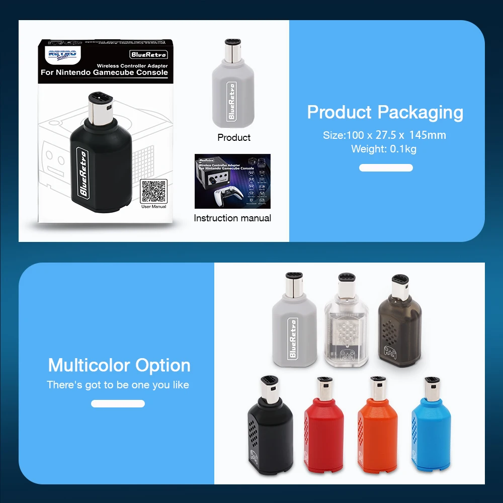 Blueretro 모터는 Gamecube 콘솔 용 싱글 플레이어 Bluetooth 호환 무선 컨트롤러 어댑터로 Wii, Switch, , PS4, PS5 와 같은 블루투스 호환 컨트롤러를 연결할 수 있습니다. Xbox One, Xbox 시리즈 X | S,8 비트 장치.