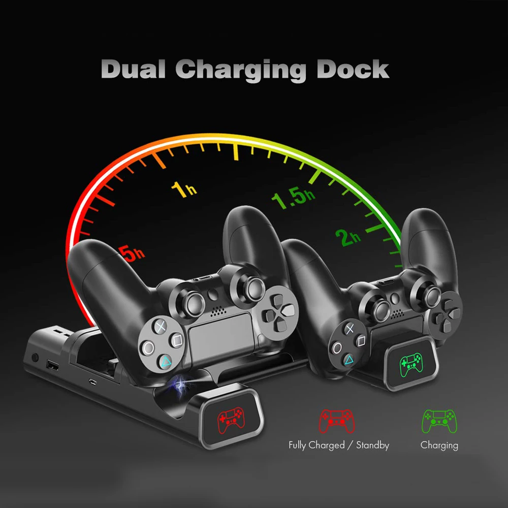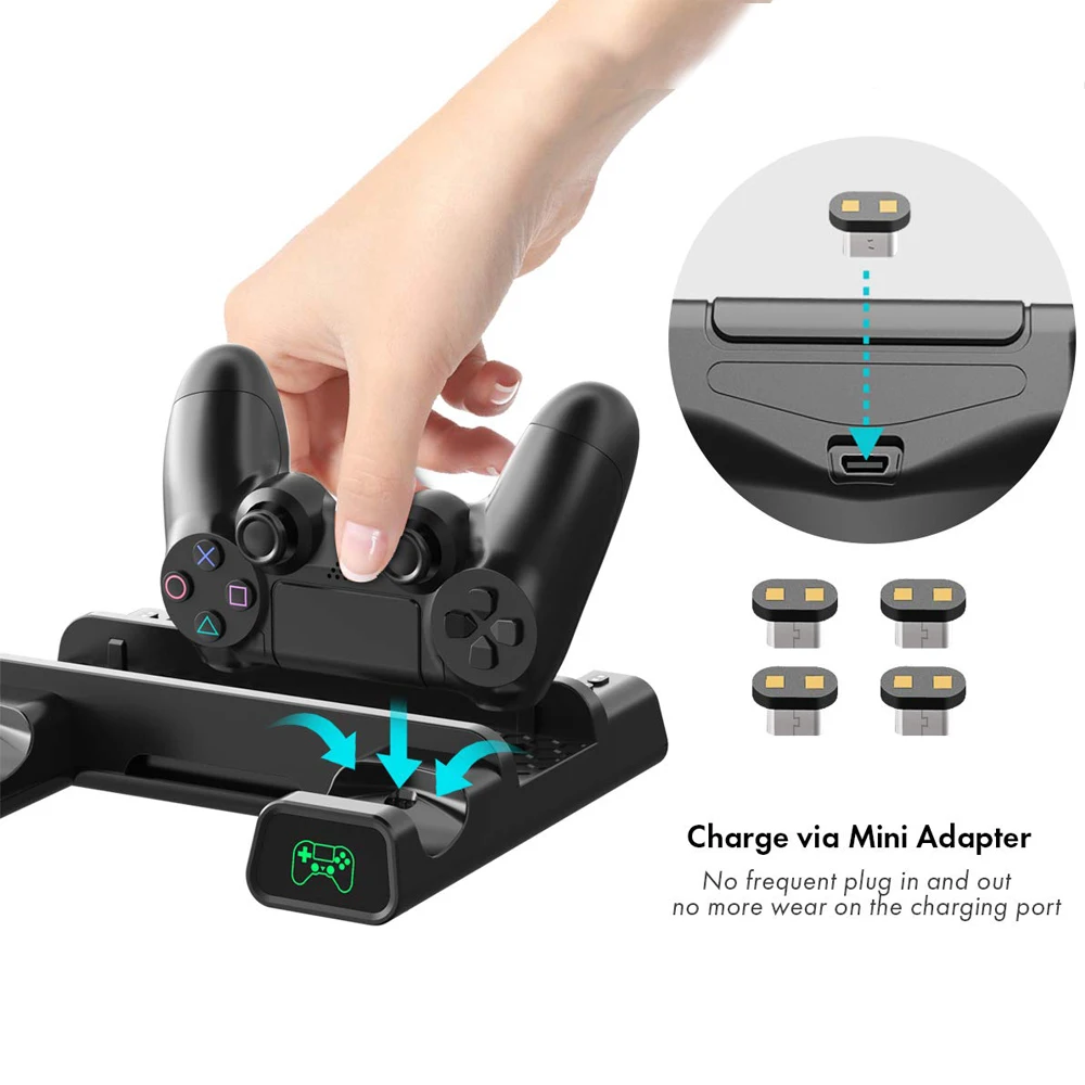 신뢰할 수있는 Ps4 컨트롤러 충전 스테이션: PS4/Slim/Pro 콘솔과 호환되며 Playstation 4 콘솔을 냉각 스탠드에 놓고 PS4 Pro를 위해 더 단단한 디자인으로 콘솔을 안전하게 보호합니다. 4 개의 미끄럼 방지 고무 패드는 충전기를 제자리에 유지하여 PS4 충전기 도크가 이동 및 떨어지지 않도록 보호합니다. (참고: PS4 슬림에 포함 된 추가 호더를 사용해야합니다.)