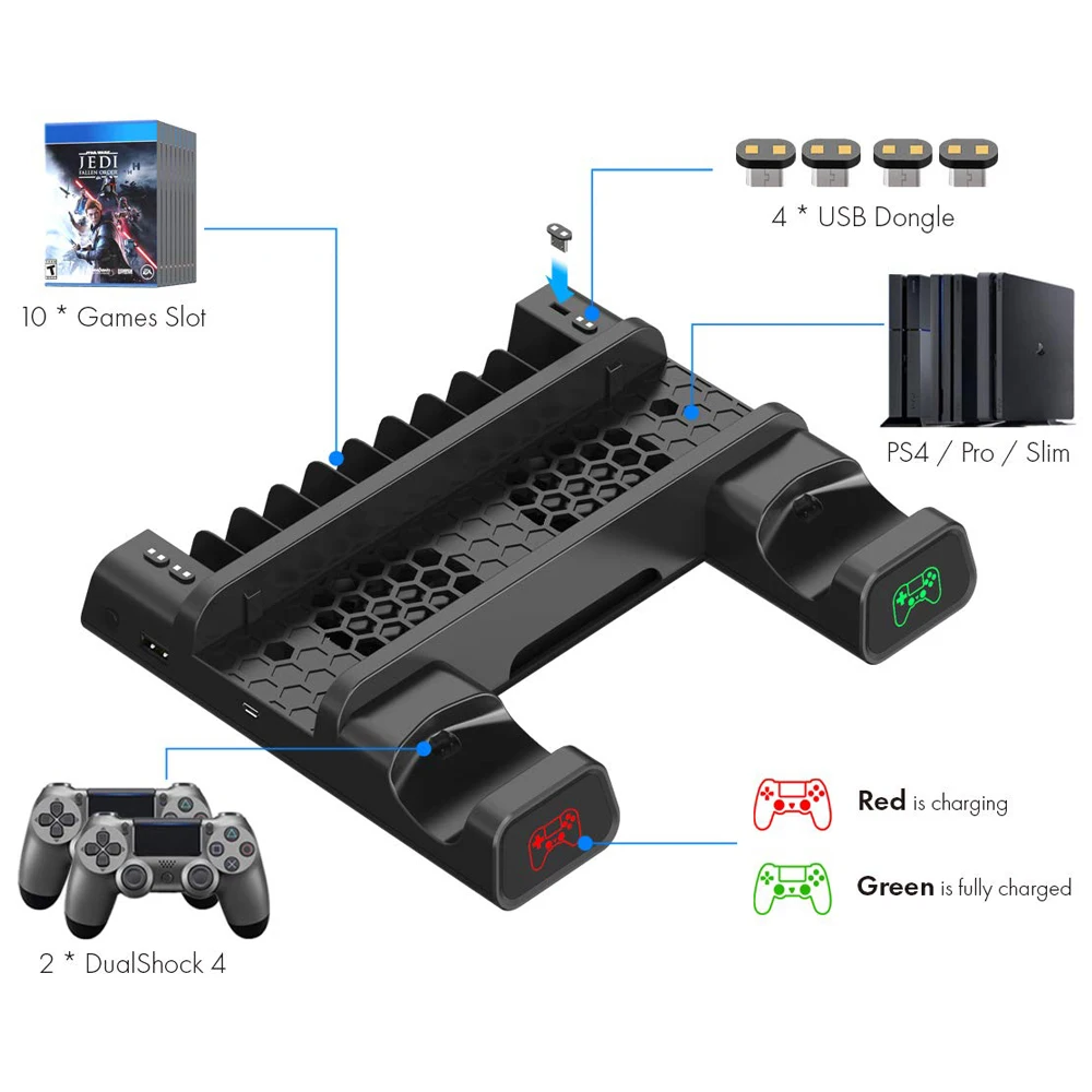 냉각 및 보관 PS4 콘솔: 듀얼 컨트롤러 충전기 스테이션과 10 개의 게임 슬롯이있는 업그레이드 된 냉각 시스템, 2 개의 컨트롤러를 동시에 충전 할 수 있으며 ps4 슬림/ps4 pro/ps4 콘솔을 냉각 할 수 있습니다. ps4 게임을 저장하고 더 이상 기기 과열에 대해 걱정하지 마십시오. 또한이 팬은 저소음으로 설계되었으며 매우 조용하며 나머지 팬에는 영향을 미치지 않습니다.
