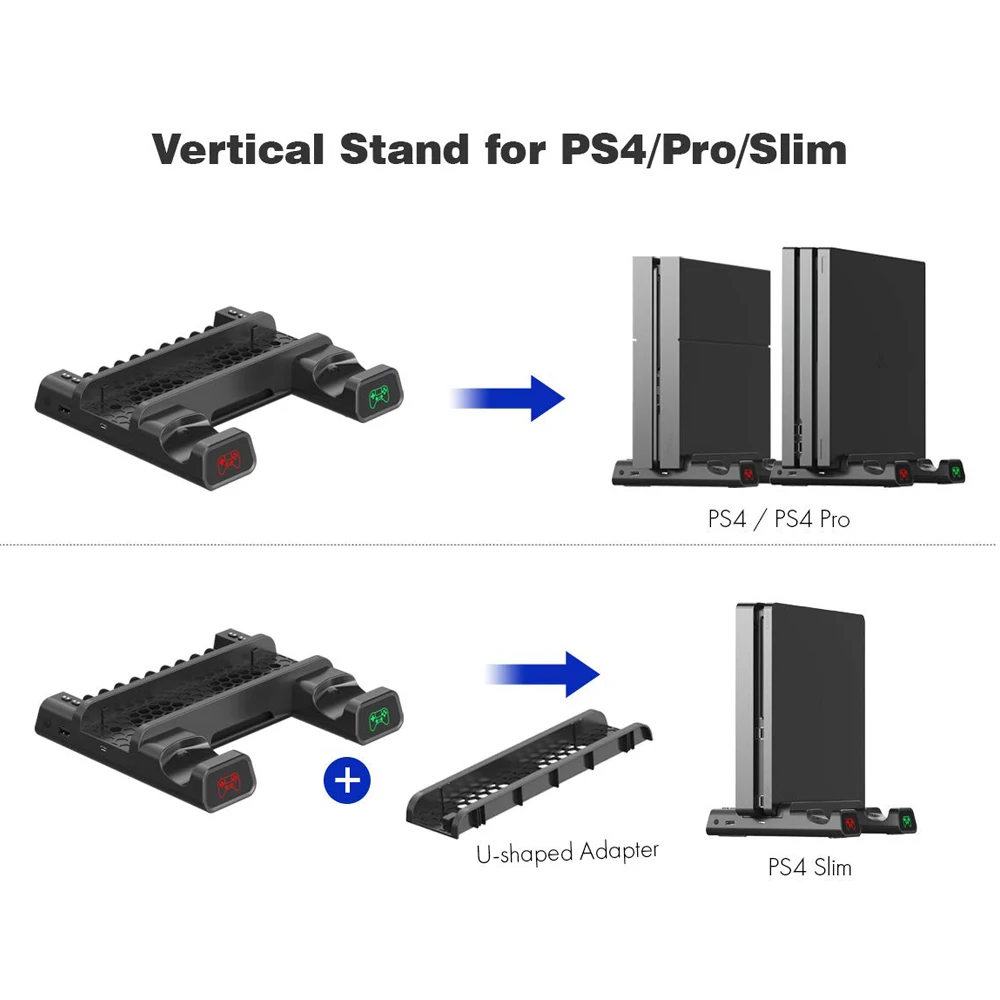 공간 절약 디자인: 냉각 팬 및 컨트롤러 충전기가있는 PlayStation 4 용 ps4 스탠드는 작고 가볍고 쉽게 휴대 할 수있는 디자인으로 어디에서나 휴대 할 수 있습니다. 더 많은 게임 콘솔 또는 기타 ps4 액세서리가있는 경우 구성 상태를 유지합니다.