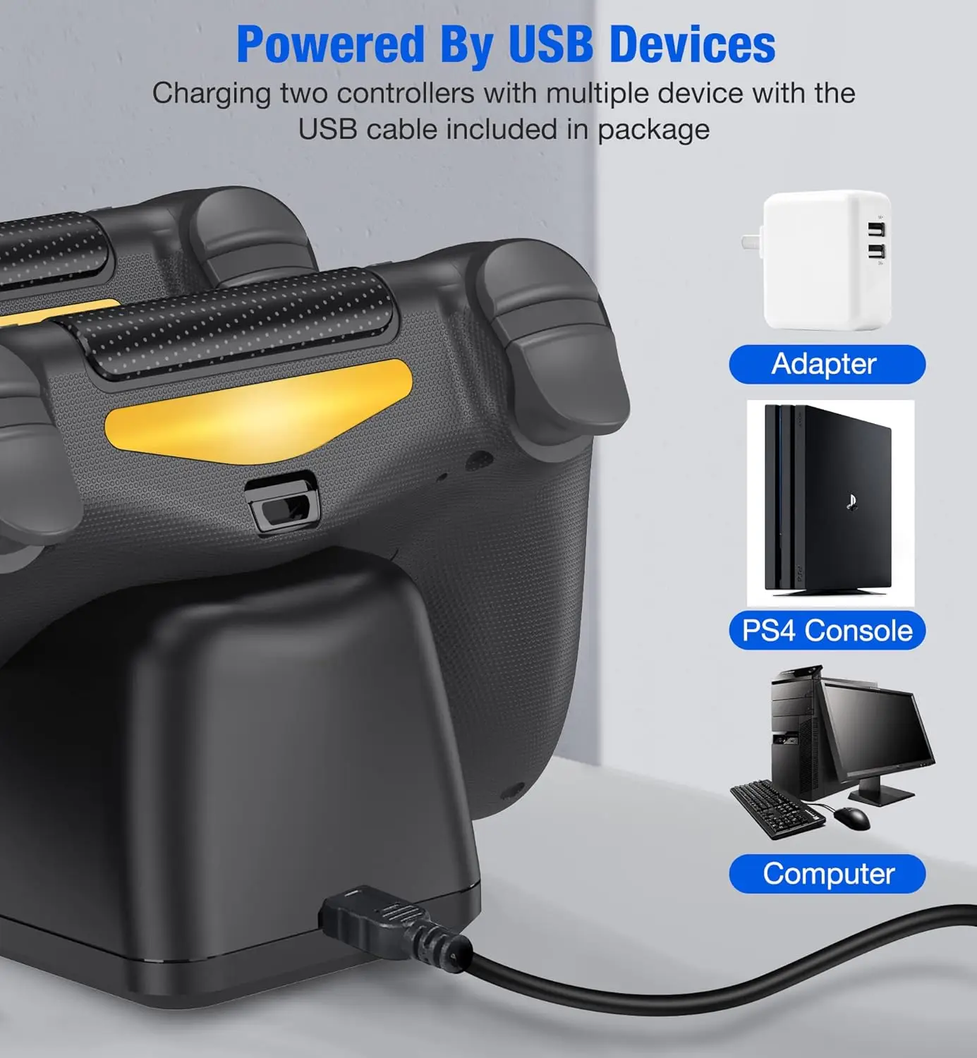 • 【다중 전원 공급 장치 및 호환성】 PS4/ PS4 Slim/ PS4 Pro 콘솔, PC 또는 벽면 전원 (참고: 벽 어댑터는 포함되어 있지 않습니다!) 그리고 플레이스테이션 4 컨트롤러 충전소 소니 PS4/ PS4 프로/PS4 슬림 컨트롤러 완벽하게 호환 가능합니다.