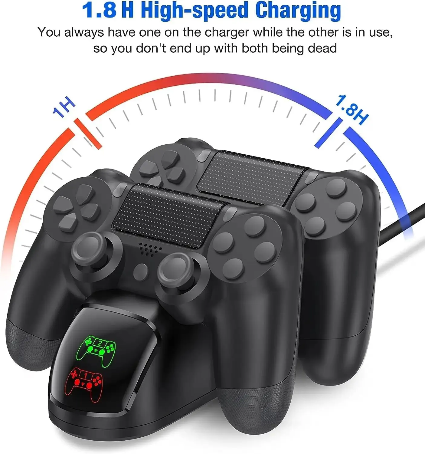 【 PS4 충전기 업데이트 1.8 시간 고속 충전 포트】 업그레이드 된 구리 접촉기가있는 ps4 듀얼 충전 스테이션은 1.8 시간 내에 ps4 리모콘을 동시에 충전 할 수있는 가장 빠른 충전 속도를 제공합니다. ps4 충전기 도킹 스테이션은 Playstation4 / PS4 / PS4 Slim / PS4 Pro 컨트롤러와 완벽하게 호환되므로 게임 시간을 절약하고 더 재미있게 즐길 수 있습니다.