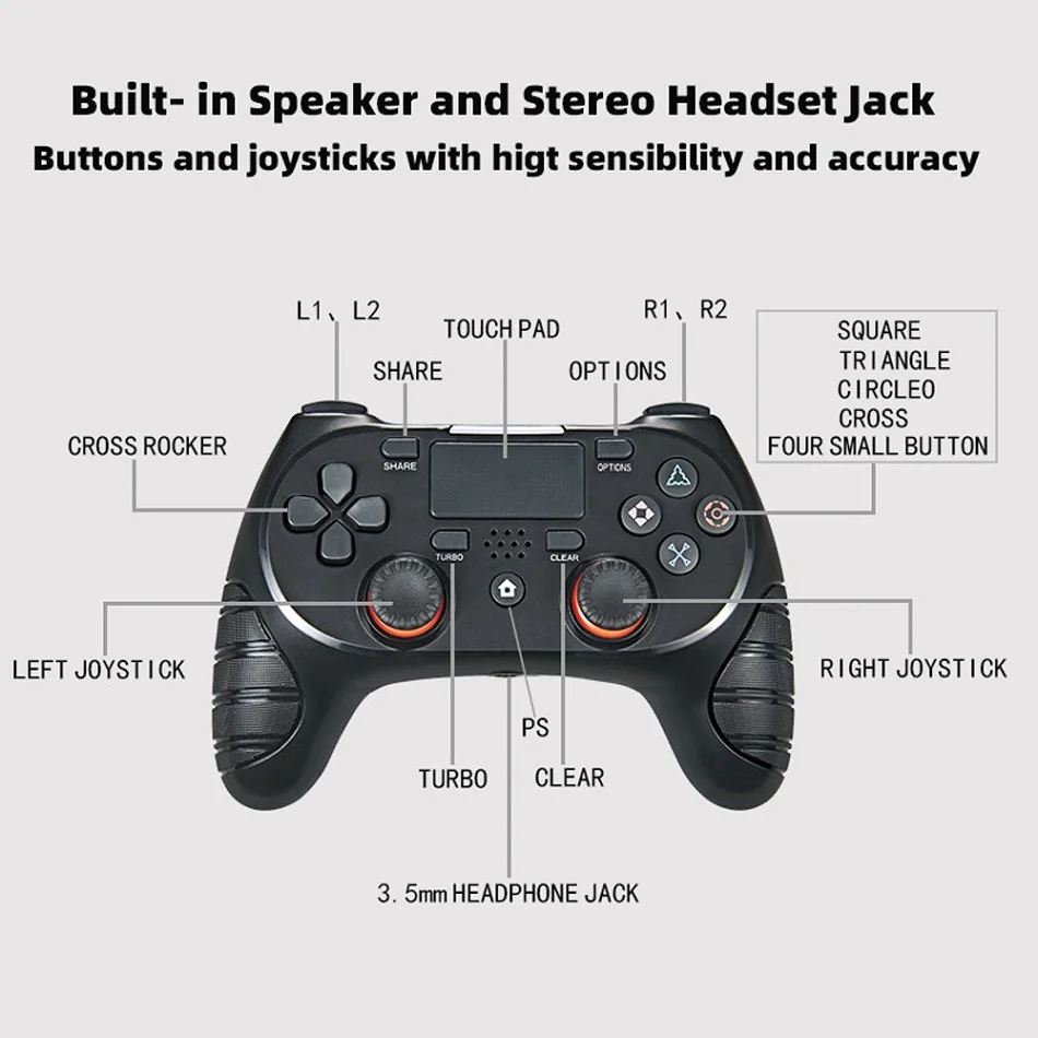 * PS4 용 100% 최신 모드 컨트롤러 * 블루투스 5.0 연결, 더 빠르고 안정적이며 유선 연결로 변경할 수 있습니다 * 버스트 기능, 쉽게 설정 및 취소 * 3 가지 색상의 라이트 바를 사용하면 다양한 색상이 다른 상태로 나타납니다 * 이중 모터 및 이중 진동, 게임 느낌 증가 * 3.5mm 헤드폰 잭, 내장 스피커는 오디오 출력에 사용할 수 있습니다 * 고감도 6 축 감지 시스템 * 보드를 터치하여 풍부한 게임 경험을 제공합니다 * 배터리 용량: 500 mAh (실제 표준)