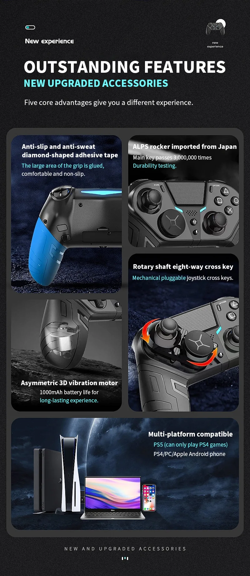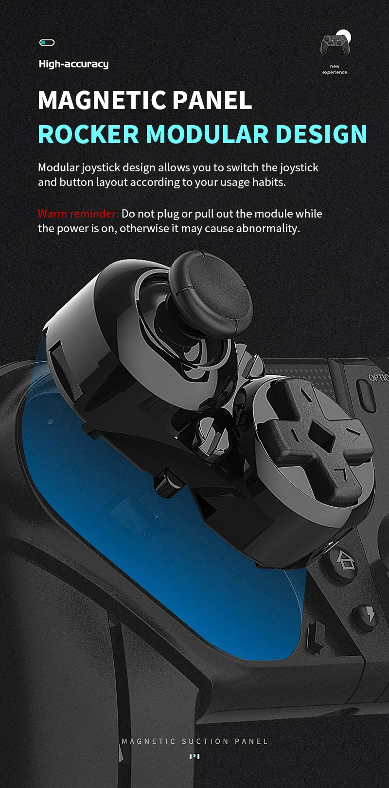-PS4 무선 컨트롤러 용 최신 버전은 왼쪽 조이스틱과 D 패드를 손에 맞게 바꿀 수 있습니다. 원하는 레이아웃을 선택하고 컨트롤러에 모듈을 설치하고 고정 블록을 고정 된 상태로 회전시킬 수 있습니다.