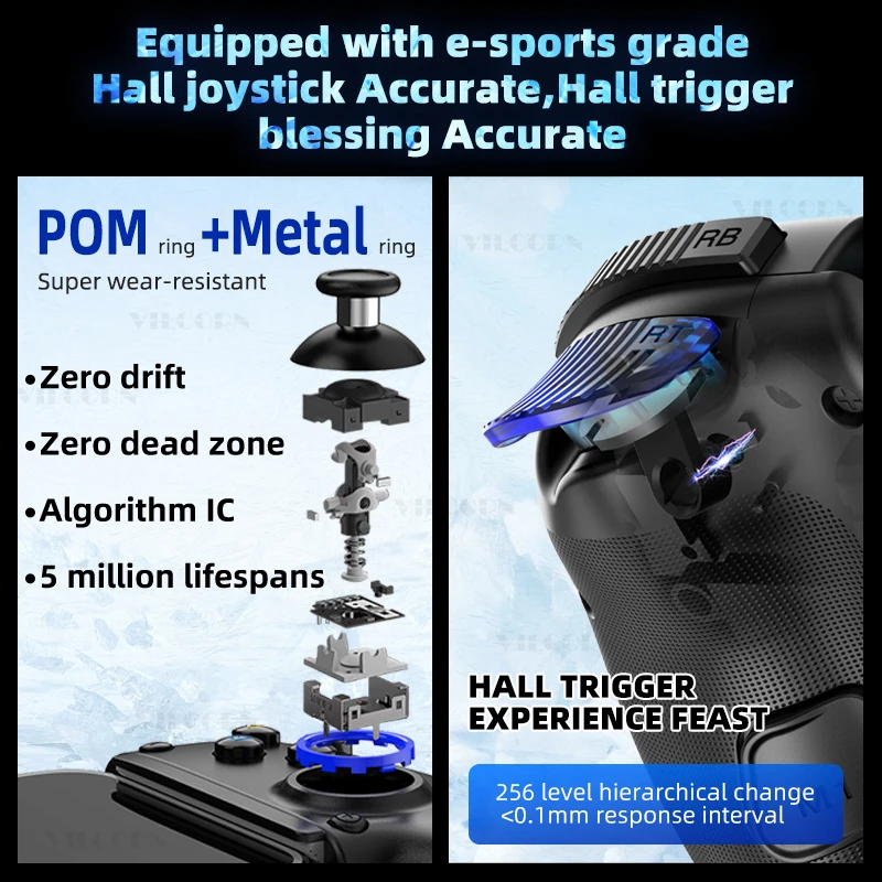 2. 듀얼 홀 트리거 및 조이스틱을 사용한 정밀 제어: 모바일 게임 컨트롤러는 섬세하고 정밀한 제어를 위해 왼쪽 및 오른쪽 홀 3D 조이스틱으로 향상되었습니다. 전자기 유도를 사용하여 전통적인 조이스틱 드리프트 문제를 해결하고 POM 링을 장착하여 조이스틱 댐핑을 크게 줄입니다. 홀 트리거는 응답 간격이 0.1mm 미만인 짧은 스트로크로 멀티 레벨 변경을 제공하여 실제 게임 경험을 그대로 재현합니다.