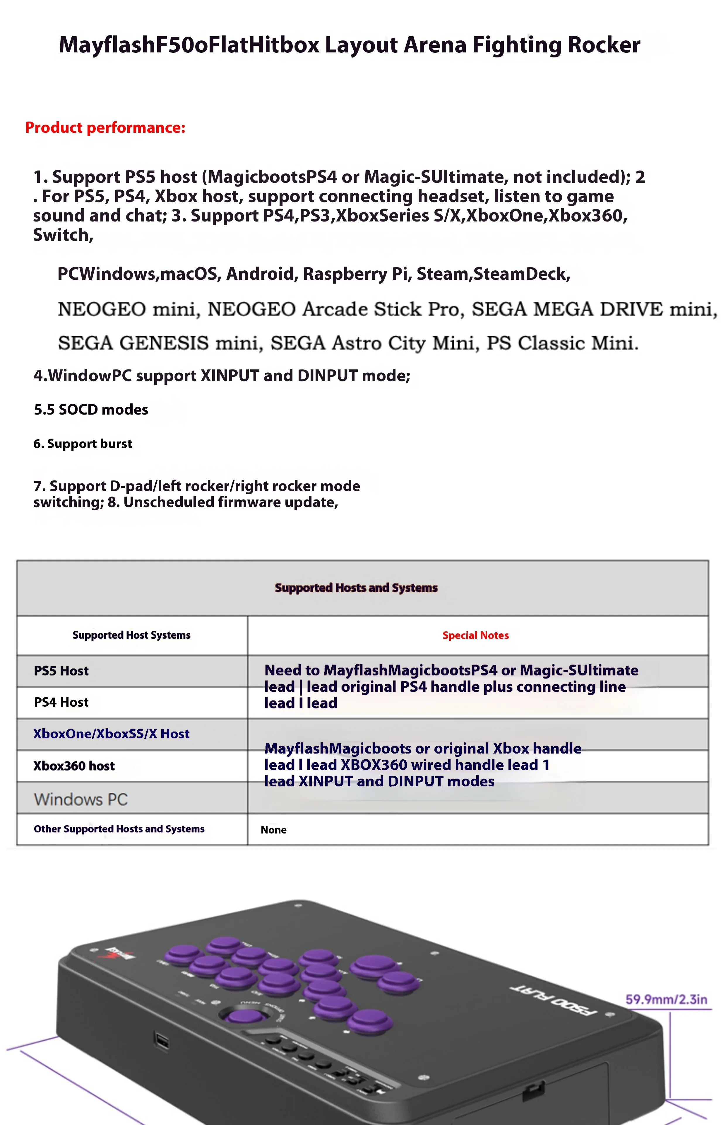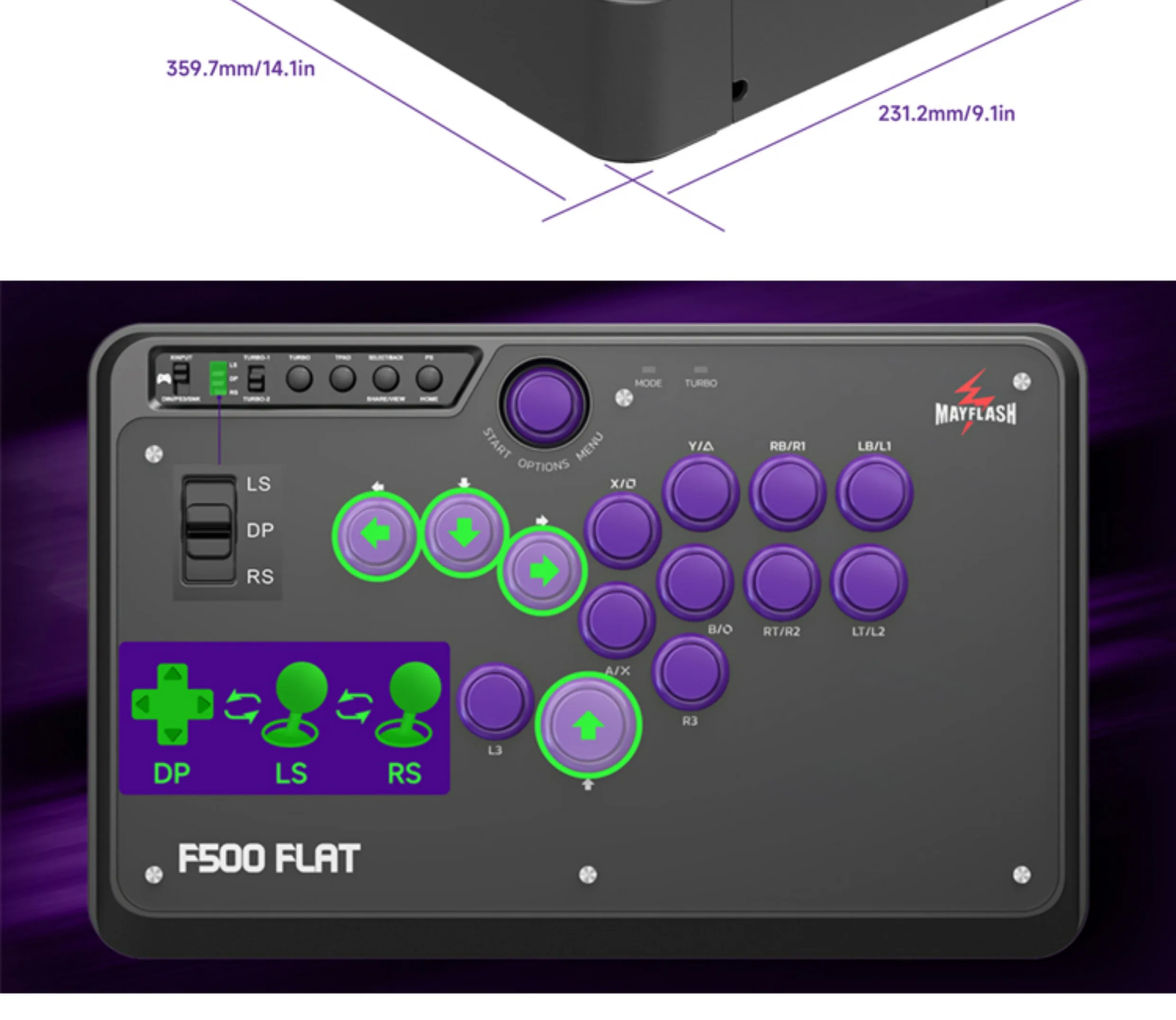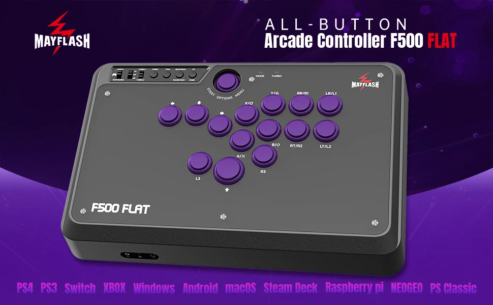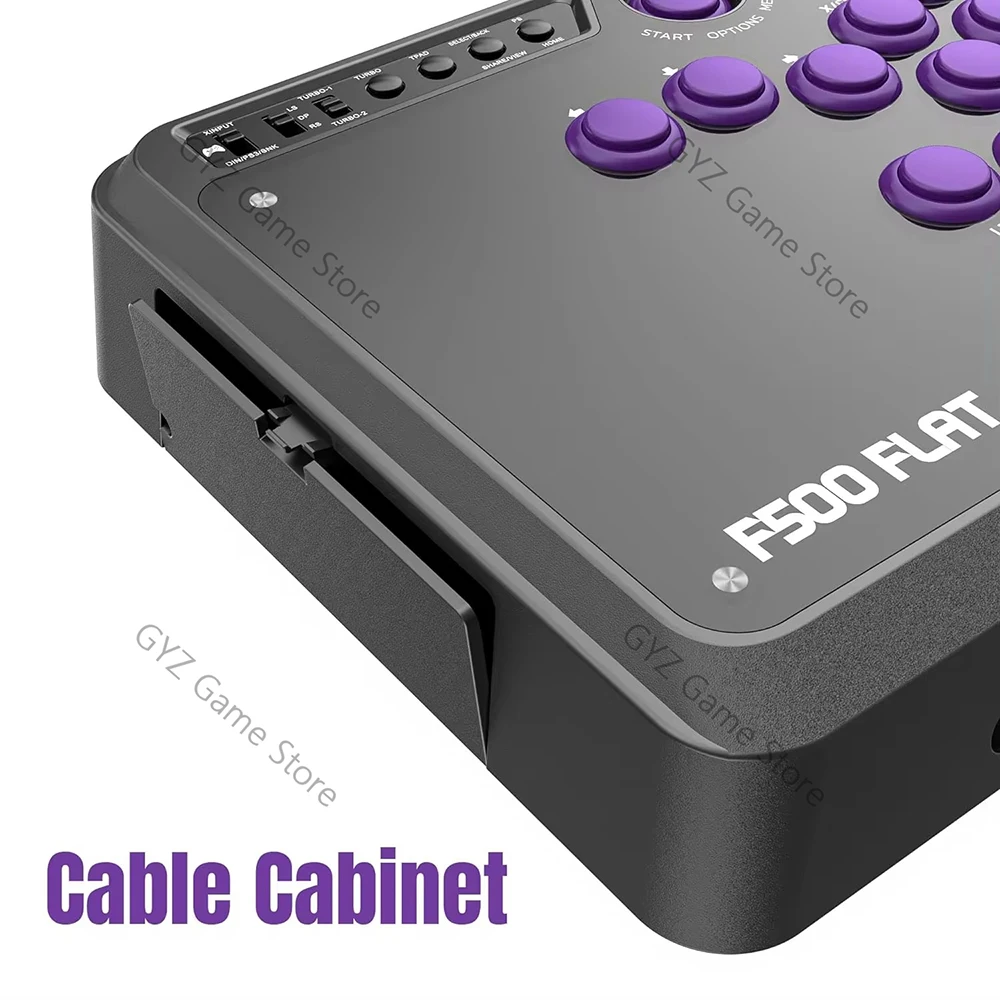 다양한 호환성-PS4, , Xbox 시리즈 S/X, Xbox One, Xbox 360, 스위치, PC 윈도우, macOS, 안드로이드, 라즈베리 파이, 스팀, 스팀 데크, 네오지오 미니, 네오지오 아케이드 스틱 프로, 세가 메가 드라이브 미니, 세가 제네시스미니, 세가 아스트로 시티 미니, PS 클래식 미니. ※ PS4, Xbox 시리즈 S/X, Xbox One 및 Xbox 360 에서 사용하려면 유선 PS4 또는 Xbox 컨트롤러를 F500 Flat의 USB 슬롯에 연결해야 합니다.