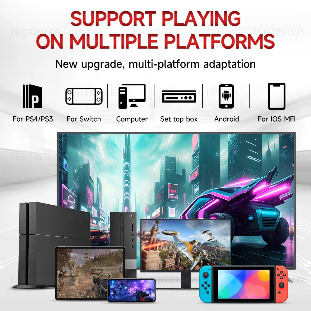이 아케이드 컨트롤러는 Nintendo Switch/PS4/ 게임 콘솔 용으로 특별히 설계되었으며 PC/Android/iOS/TV Box 장치를 지원하여 게임 경험을 향상시킬 수 있습니다.