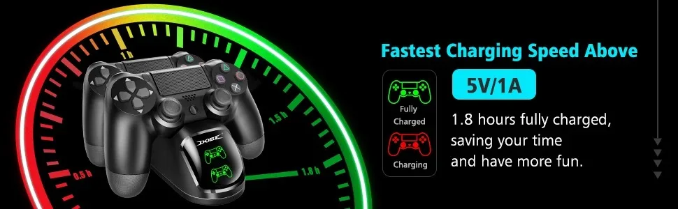 【 PS4 충전기 업데이트 1.8 시간 고속 충전 포트】 업그레이드 된 구리 접촉기가있는 ps4 듀얼 충전 스테이션은 1.8 시간 내에 ps4 리모콘을 동시에 충전 할 수있는 가장 빠른 충전 속도를 제공합니다. ps4 충전기 도킹 스테이션은 Playstation4 / PS4 / PS4 Slim / PS4 Pro 컨트롤러와 완벽하게 호환되므로 게임 시간을 절약하고 더 재미있게 즐길 수 있습니다.