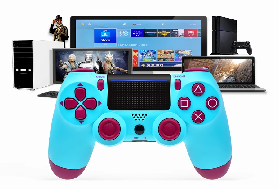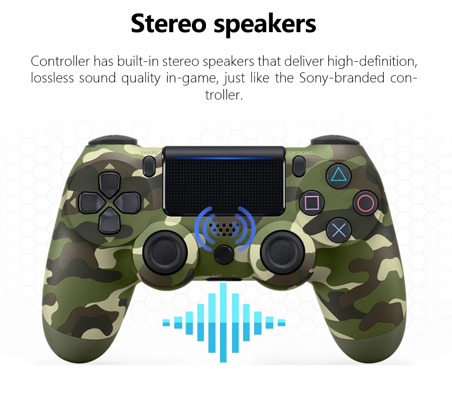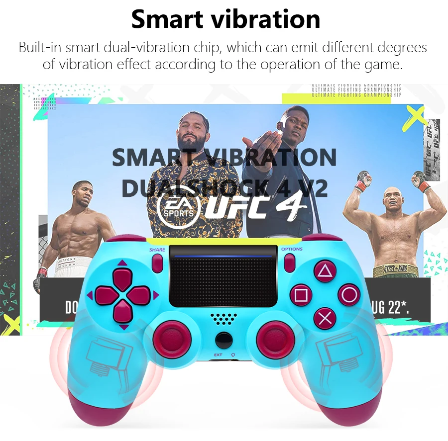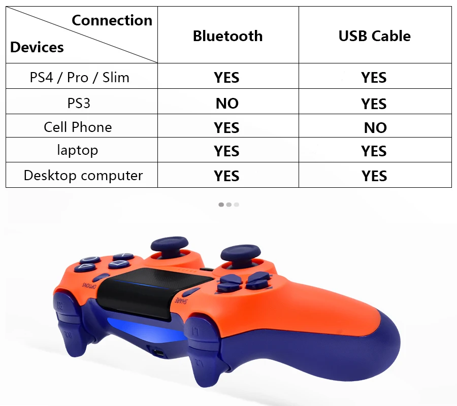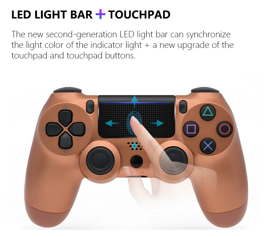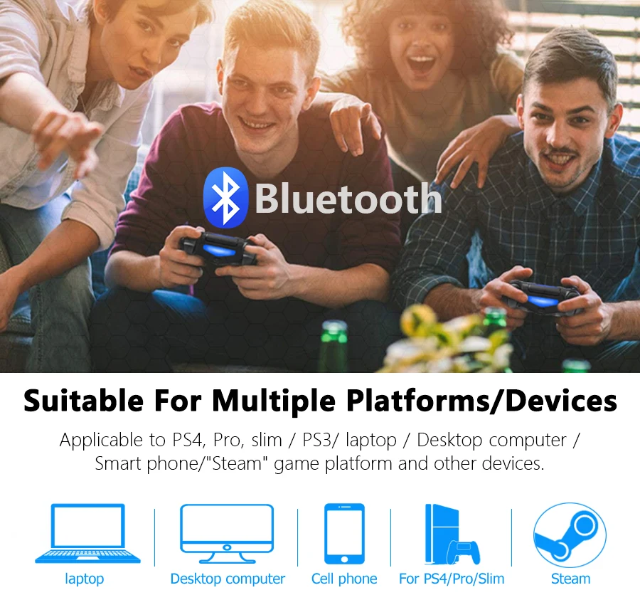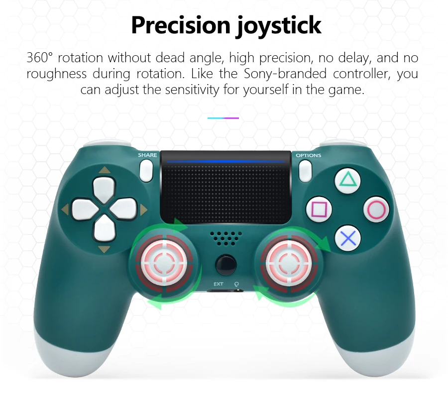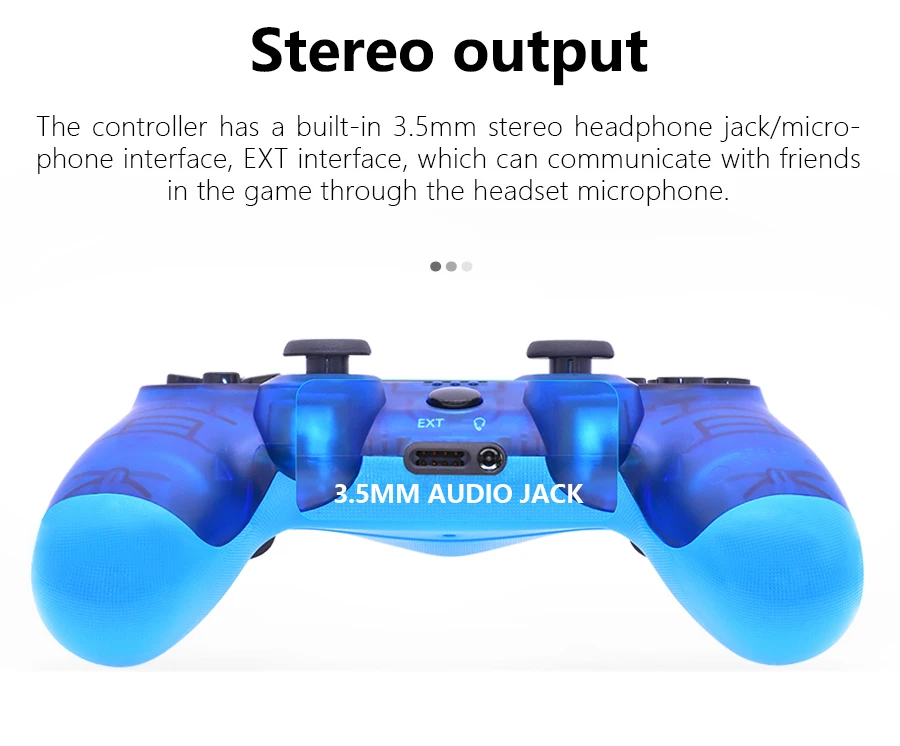 이 게임 패드는 무선 블루투스 연결, USB 케이블 연결, 왼쪽 및 오른쪽 이중 진동, 6 축 센서, 헤드폰 잭, EXT 잭, 터치 패드 기능, 내장 스테레오 스피커, LED 라이트 바 및 기타 기능. PS4/PS4 Pro/PS4 Slim//PC/휴대 전화 (iOS, Android) 및 iPad 및 기타 장치에 적합 (자세한 지침은 아래의 특정 설명을 참조하십시오)