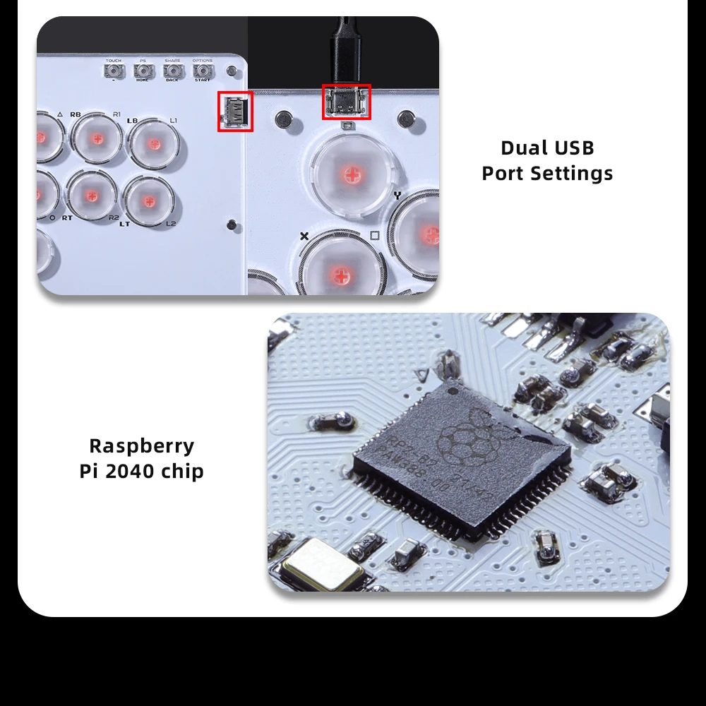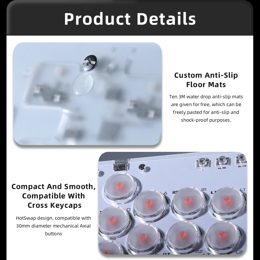RGB 조명 효과가있는 투명한 릴 소재, 16 개의 버튼이있는 확대 된 히트 박스 스타일의 아케이드 키보드로 편안한 느낌을 제공하고 격투 게임을 즐길 수 있습니다. 구매자는 자신 만의 히트박스 스킨을 만들어 컨트롤러를 더 시원하고 개인화되도록 만들 수 있습니다