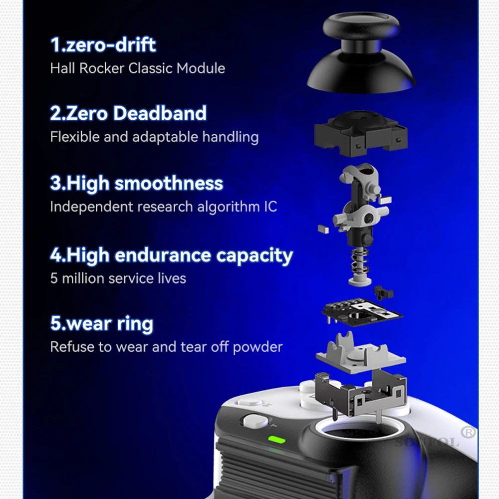 D9 조이스틱은 수년간의 업계 경험과 게임 알고리즘과 결합 된 수백만 명의 플레이어의 습관에 대한 연구를 지원하여 홀 조이스틱을 적용하여 경험을 향상시킵니다.