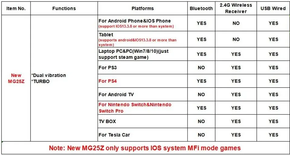 2) 적용 가능한 장치: 스마트 폰/태블릿/스마트 TV, 셋톱 박스/PC/ 콘솔/n 스위치 콘솔; (블루투스, 2.4g, 유선 연결)