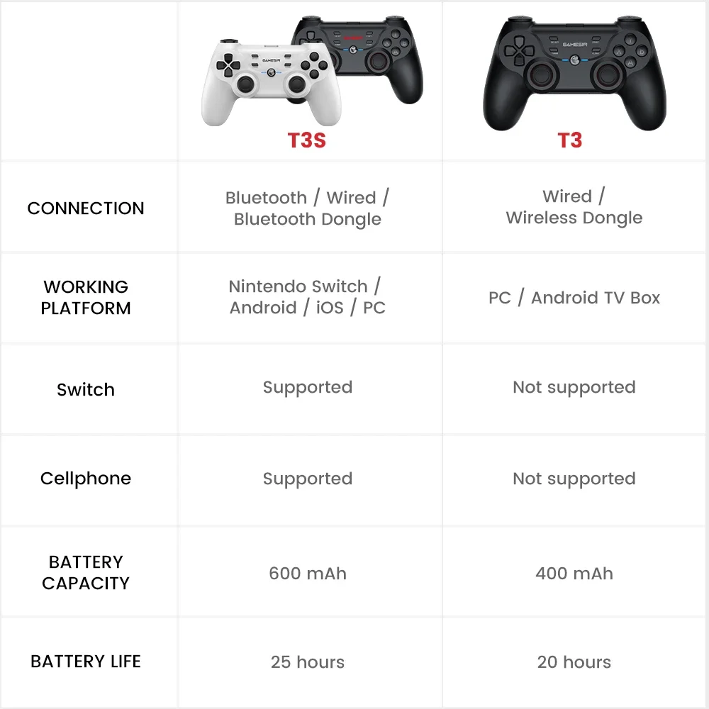 내장 400mAh 리튬 배터리, GameSir T3 는 최대 40 시간의 배터리 수명을 제공 할 수 있습니다. 게이머가 배터리 부족 불안을 없애고 즐거운 논스톱 플레이 타임을 즐길 수 있도록 도와줍니다.