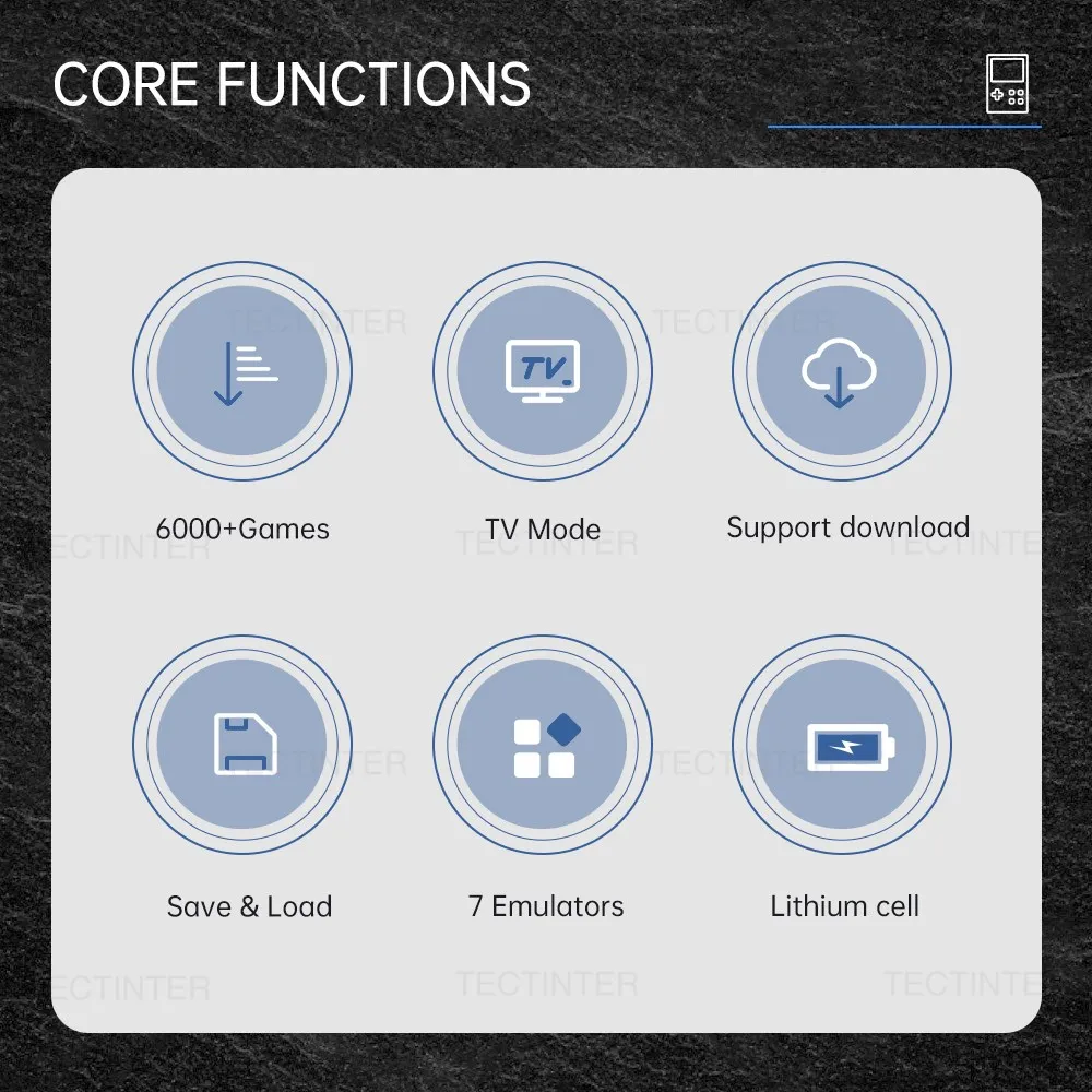 이 휴대용 게임 콘솔에는 6000 개 이상의 고전 게임, 3.0 HD 화면, 고정밀 조이스틱이 있는 고화질 부드러운 화면, 게임 다운로드 및 수집 지원, 다양한 게임을 다루는 7 가지 종류의 에뮬레이터를 지원합니다.