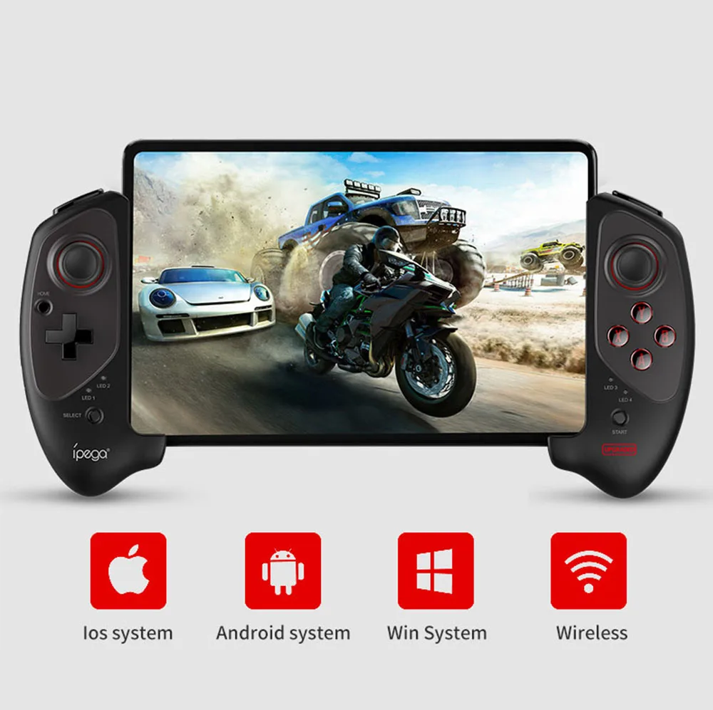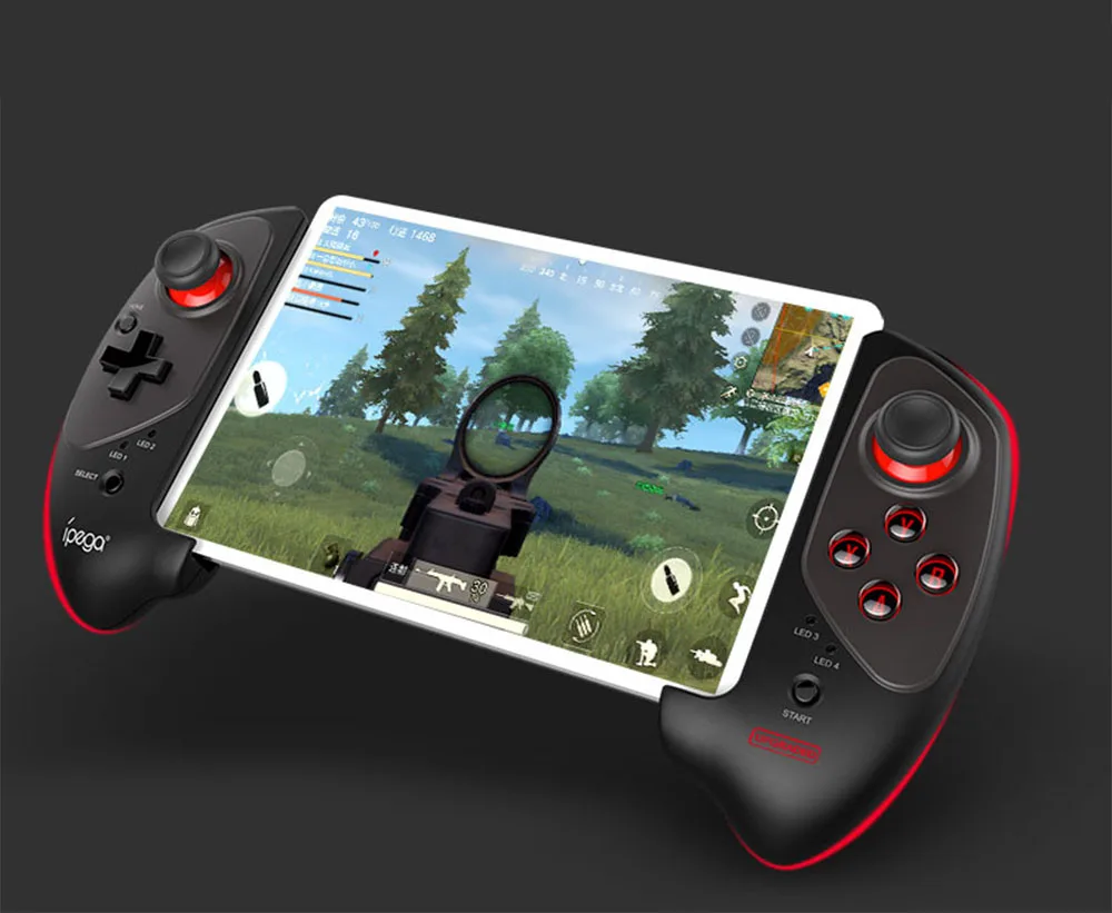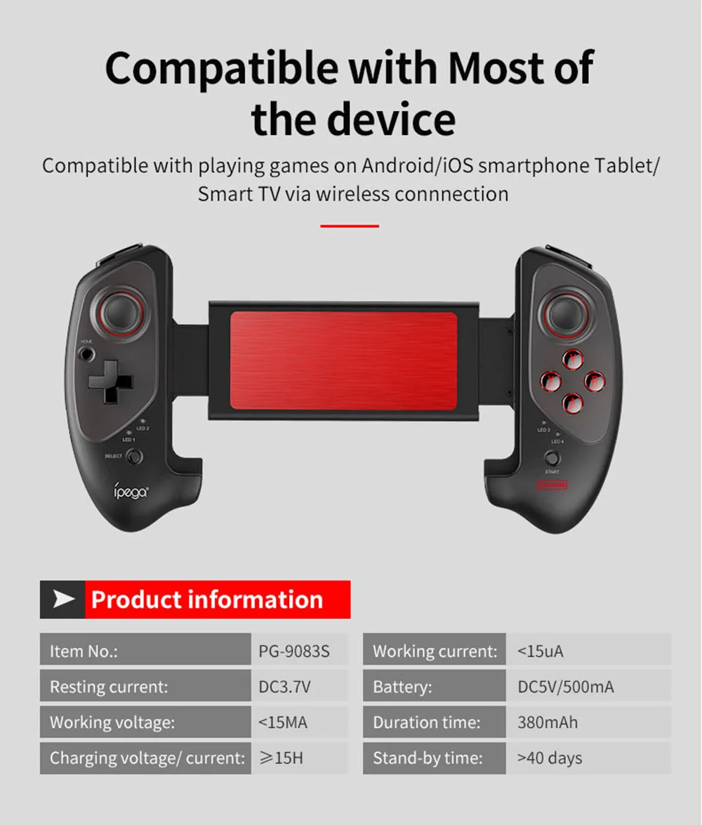 Ipega PG-9083s 보편적 인 무선 게임 패드로 안드로이드/iOS 스마트 폰 및 태블릿에서 재생할 수 있습니다. 또한 컴퓨터에서 재생할 수도 있습니다. 슬라이딩 게임 패드-디자인 덕분에 태블릿을 수평 위치에 맞출 수 있습니다. 게임 콘솔 마운트를 사용하면 최대 28 cm 너비의 장치를 장착 할 수 있습니다. 모바일 온라인 저격수 PUBG, 생존 규칙, Fortnite 등을위한 기성품 제어 체계 완전히 충전 된 내장 380 mAh 배터리를 사용하면 충전없이 최대 10 시간 동안 재생할 수 있습니다. 블루투스 조이스틱 iPega PG-9083s 태블릿이나 스마트 폰을 본격적인 모바일 게임 콘솔로 전환합니다.