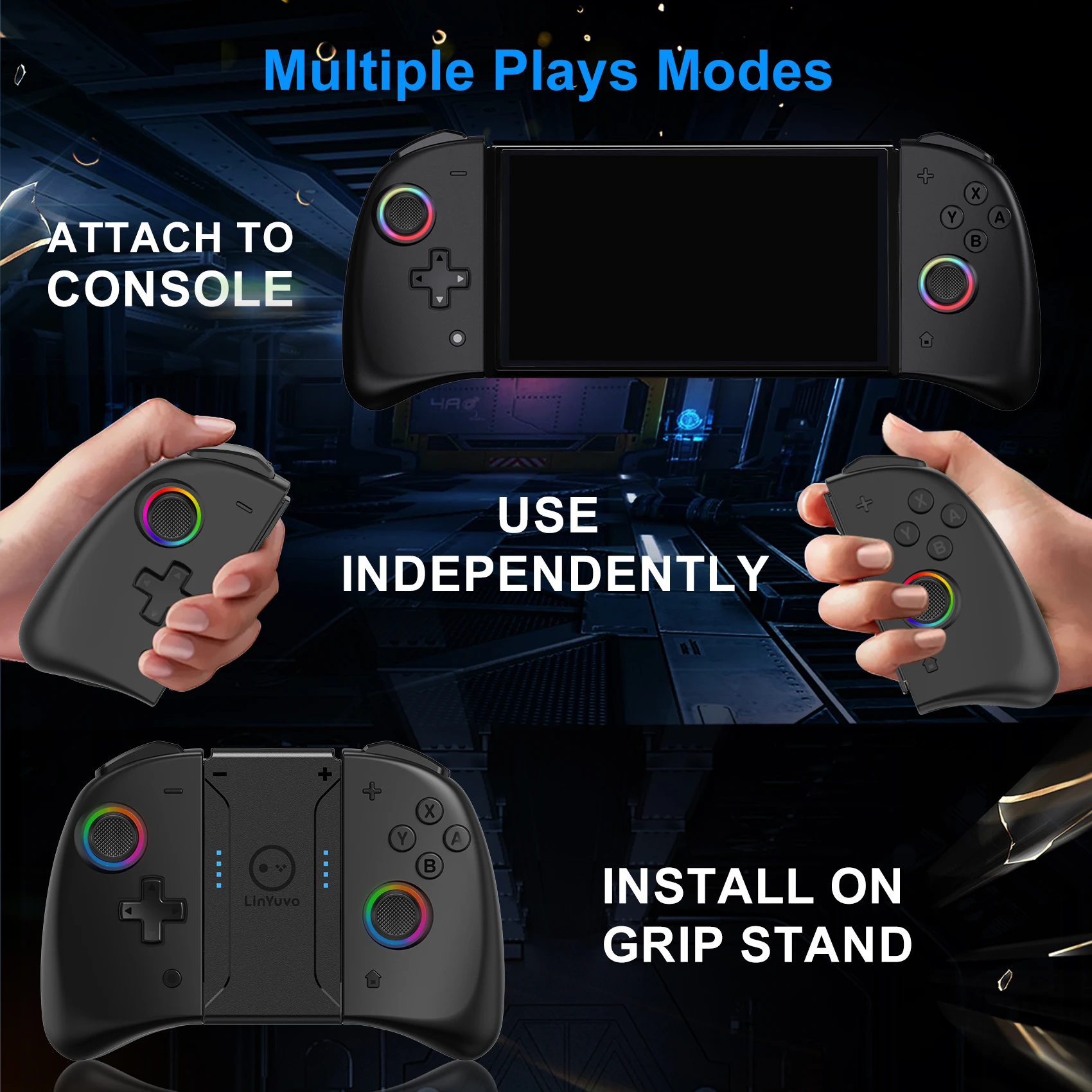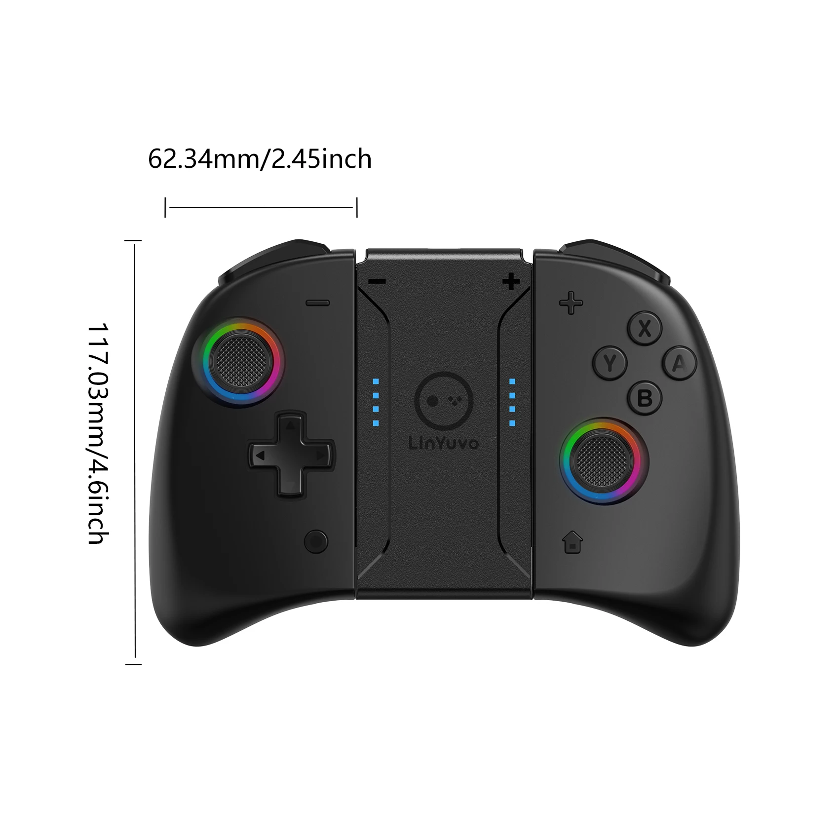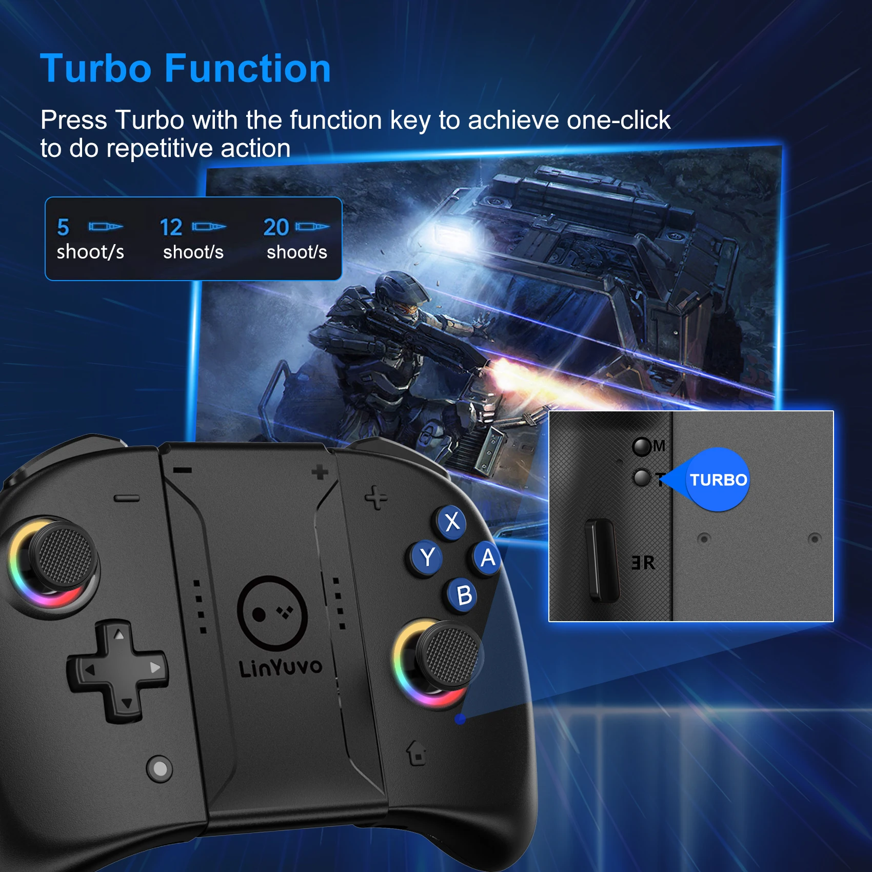 【RGB 조이스틱 라이트 링】 이 컨트롤러는 재생 중에 더 나은 시각적 경험을 위해 조이스틱 주위에 RGB 라이트 링으로 설계되었습니다. 다른 색상과 고유 한 조명 모드 중에서 선택하여 컨트롤러를 강조 표시하십시오.